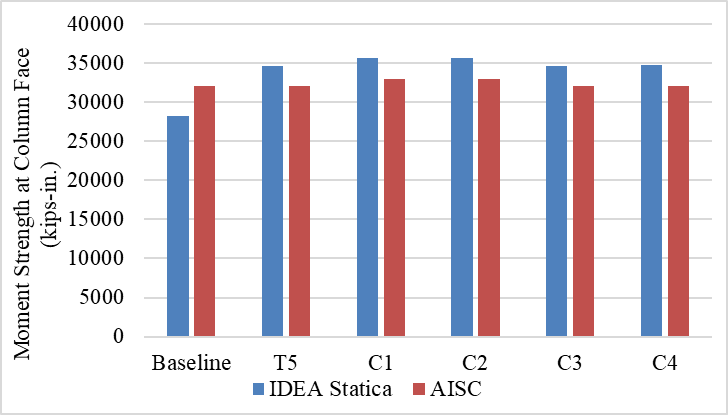 Regarding the variation specimens (see Section 3.2), it was observed in the experimental study (Ricles et al., 2000) that the specimens failed due to severe local buckling and fracture in the beam flanges (Figures 3.6 through 3.10). Similarly, IDEA StatiCa analysis showed that specimens T5, C1, C2, C3, and C4 reached their capacities at beam web that reached 5% plastic strain limit (Figures 3.13 through 3.17). On the other hand, based on the AISC design checks, failure was expected to occur in the beam although some of the checks were not fully satisfied (e.g., continuity plate and weld access hole in Table 3.3). This is because of a slight difference in geometric requirements. The moment capacity of all specimens calculated using IDEA StatiCa (Table 3.5) and following AISC procedure (Table 3.4) are presented in Figure 3.23.
