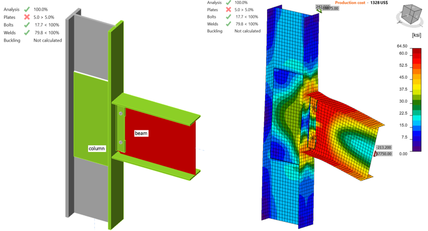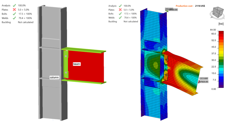 Specimen C1 was modelled and analyzed in IDEA StatiCa following the same procedure. It was observed that the beam web reached 5% plastic strain when the shear force and the corresponding moment were 212.60 kips and 37,650  kips-in., respectively (Figure 3.14).