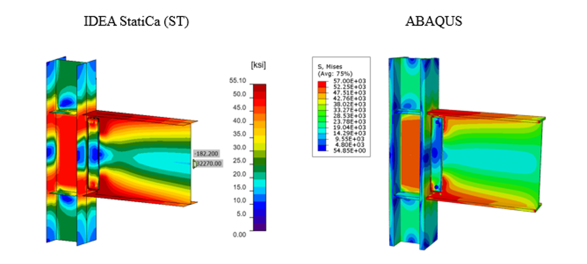 The maximum predicted stress in IDEA StatiCa was 55.90 ksi on the beam top flange (note that the IDEA StatiCa legend shows the design data) while the ABAQUS model shows a maximum stress of 56.5 ksi at the same location. The maximum stress of 57 ksi in the ABAQUS legend belongs to the front long weld line connecting the shear tab to the column. The slightly different stress distribution is likely due to the consideration of the length of the column in ABAQUS and the way that boundary conditions have been applied, utilization of finer mesh in the FE analysis, and the simplified CAD model in IDEA StatiCa. Note that the authors performed a routine mesh sensitivity analysis for the IDEA StatiCa model as well and some inconsistencies in the results were observed.
