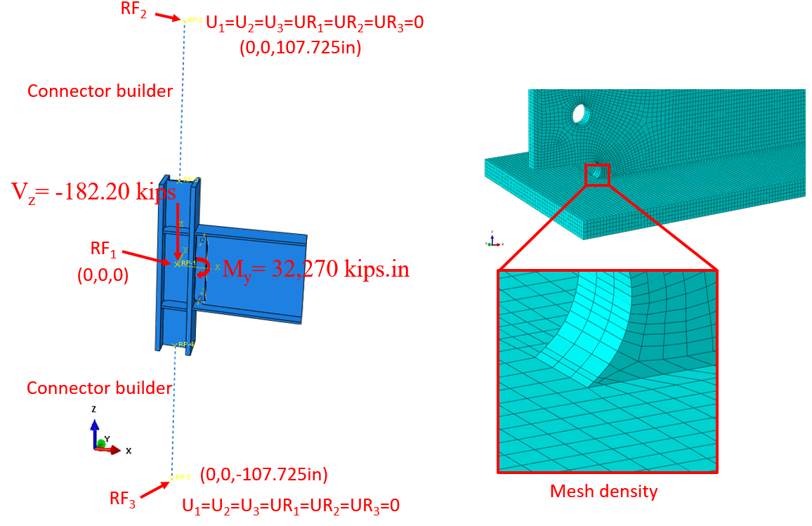 In this section, the baseline model developed in Section 3.4.1 was constructed again using ABAQUS software (version 2022) for FE analysis and results were compared with IDEA StatiCa. The CAD model for the FE analysis was generated using the IDEA StatiCa’s viewer platform. The two bolts and 5 weld lines (i.e., between the shear tab-beam web and shear tab-column flange) were then added manually to the assembly using the CAD interface in ABAQUS. The vertical load of 182.2 kips and the corresponding moment of 32,270 kips-in. (around Y axis) were applied to a defined reference point (i.e., RF1) at the column centerline as shown in Figure 3.18. The analytical length of the column in IDEA StatiCa was 215.45 in. Therefore, to mimic the identical column length in ABAQUS, two other reference points (i.e., RF2 and RF3) were introduced 107.725 in. away from the center of the column along the Z axis in both directions (see Figure 3.18). These two reference points were fixed in all directions and were connected to the top and bottom faces of the column using the connector builder module in ABAQUS. In ABAQUS, the element size was chosen to be between 0.1–0.25 in. after mesh sensitivity analysis and a total of 240,417 elements were generated. The 3D stress, 8-node linear brick reduced integration (i.e., C3D8R ) was selected as element type.
