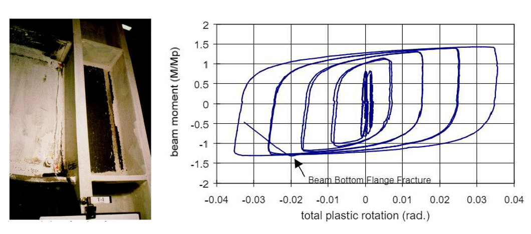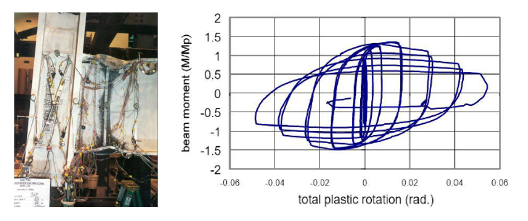 Figure 3.5: Left) Baseline model (T1) after testing; Right) moment-total plastic rotation relationship (Ricles et al., 2000)