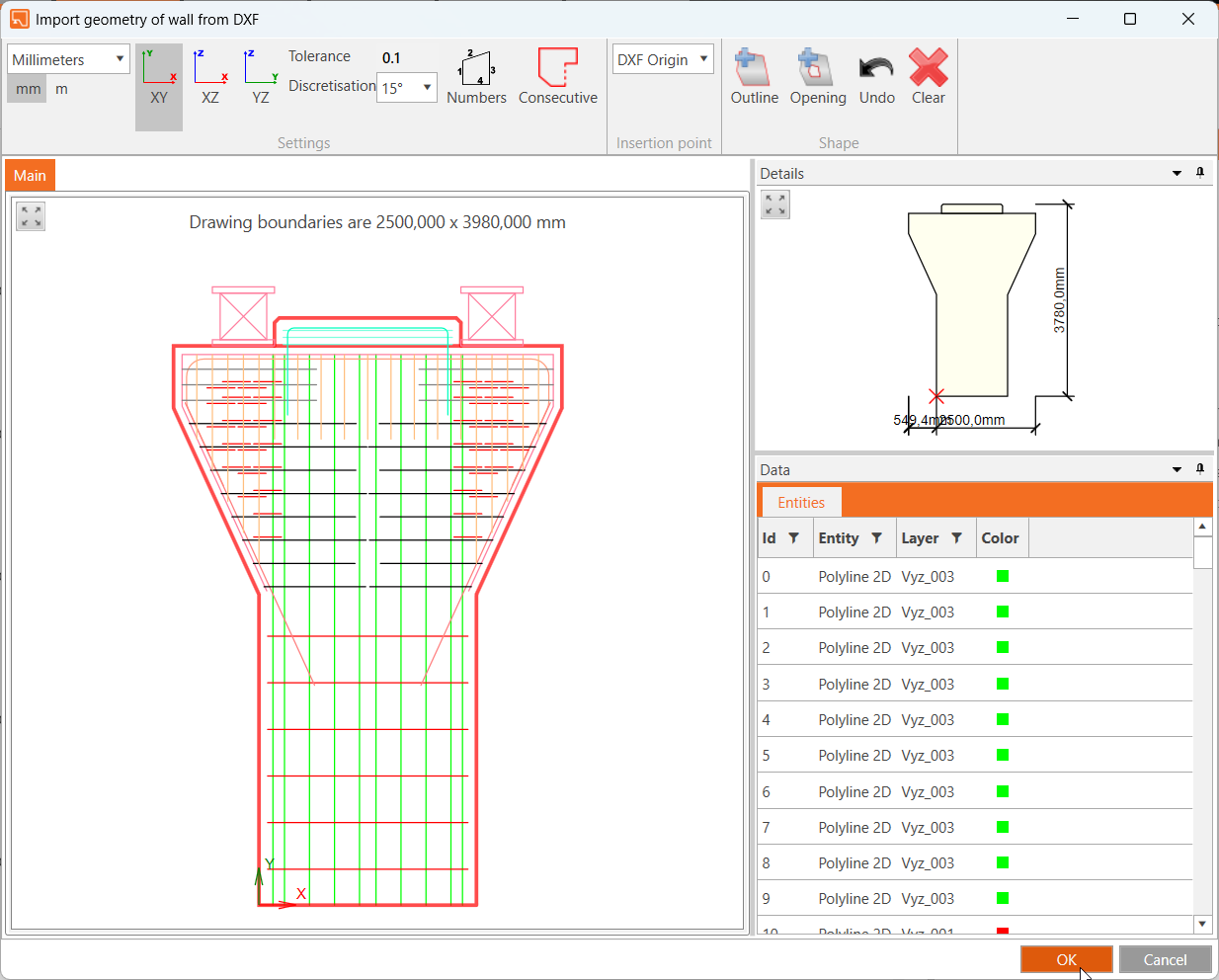 - Het importeren van de geometrie en wapening via een DXF-bestand