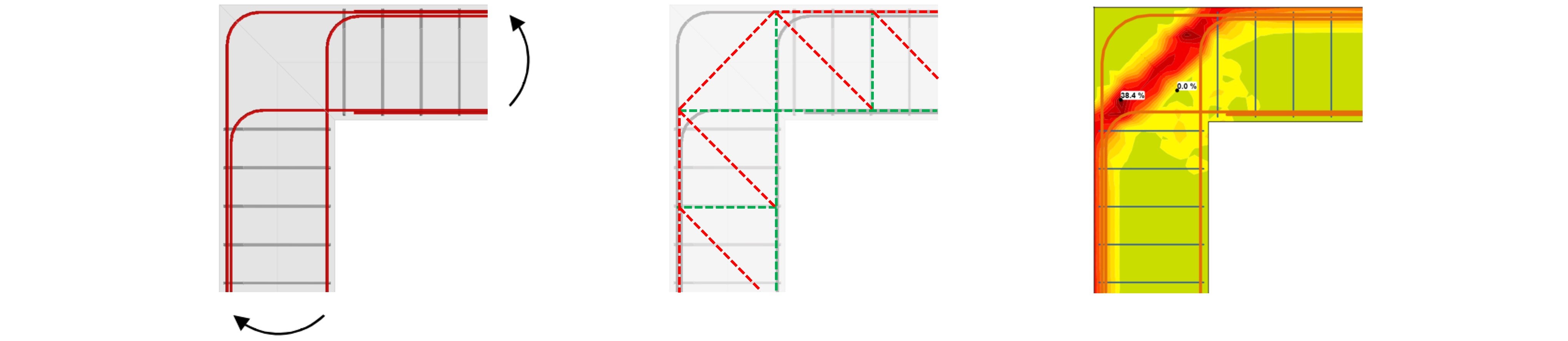 Door het gebruik van de CSFM (Compatibele Spanningsveldmethode) kunnen discontinuïteitsgebieden eenvoudig en nauwkeurig worden berekend met IDEA StatiCa Detail. Strut-and-Tie, ofwel Vakwerkmodellen worden nog vaak gebruikt voor het berekenen en controleren van betonnen D-gebieden. De toepassing ervan is echter omslachtig en tijdrovend, omdat er iteraties nodig zijn en er met meerdere belastingsgevallen rekening moet worden gehouden. Bovendien is deze methode niet geschikt voor het verifiëren van bruikbaarheidscriteria (vervormingen, scheurwijdten, enz.). Met gebruik van IDEA StatiCa Detail kan men alle benodigde controles uitvoeren, zowel voor de UGT als voor de BGT.