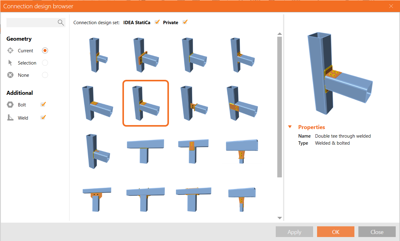 In case, the first idea won't become the best solution, by simple right-click with the 'Connect to' feature, other dozens of designs pop up in the Connection browser window. Here, not only the default sets but also the user's designs are stored and the suitable ones for the specific geometry are displayed in seconds.