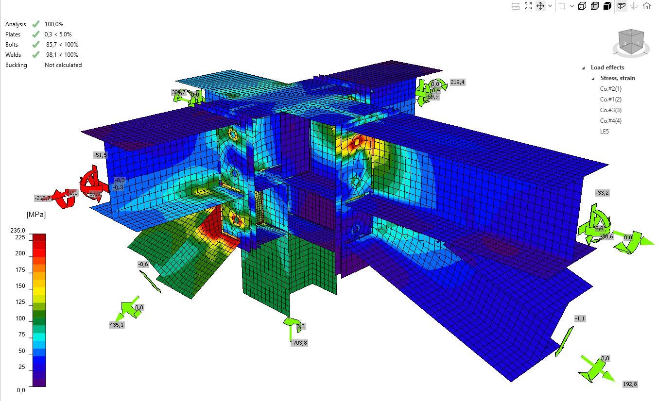 Two other IDEA StatiCa functionalities were crucial. The Connection Library allowed reuse of designs for the many similar but not identical nodes. Bulk design in Checkbot grouped similar connections so that a reference connection could be analyzed and then automatically verified across the group, leaving only a handful that required local refinements. For communication with the steel contractor, the ideacon file and calculation report completely replaced traditional sketches. IDEA StatiCa Viewer allowed the contractor to independently inspect the geometry, loads and details of the connections. Even the inspection office used IDEA StatiCa, allowing transparent verification of the entire connection design.
