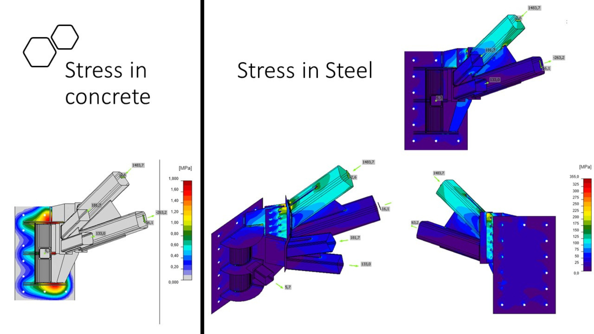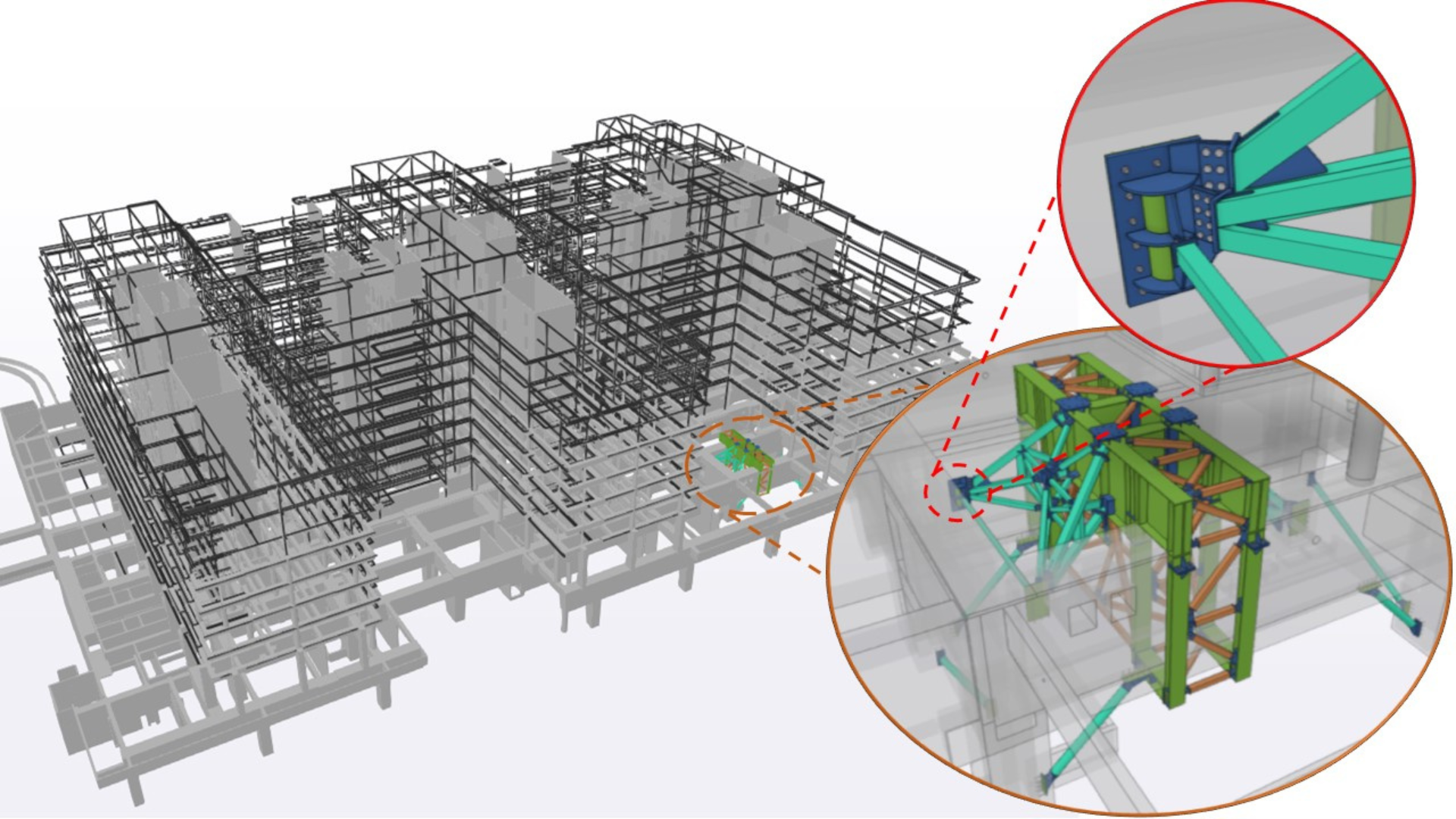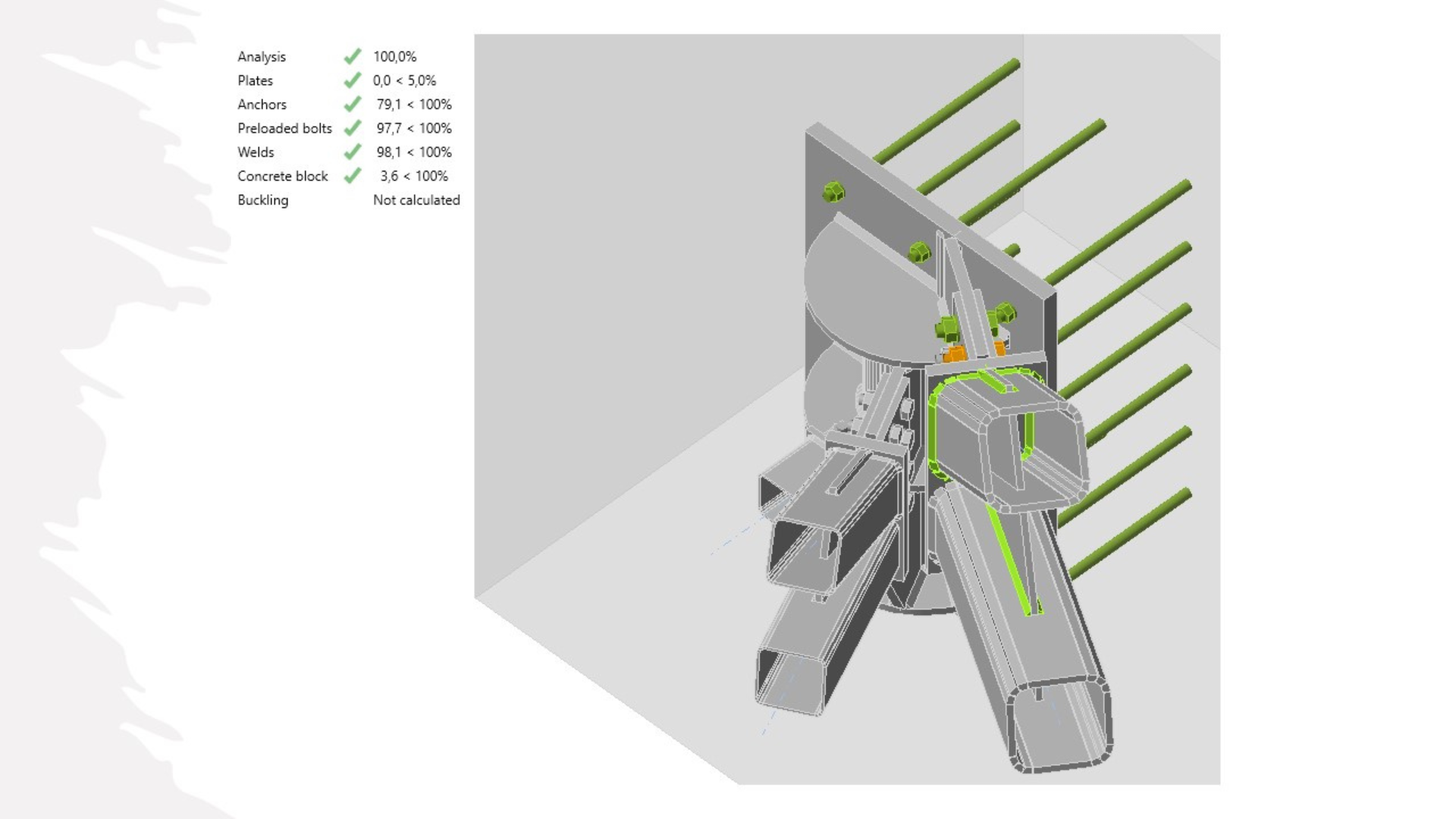 This structure at the base of the cranes was then connected to deep permanent RC beams by means of an intricate steel-to-concrete joint connection, with several steel bars concurring to the same setting-out point. IDEA StatiCa Connection, along with Tekla Structures (from which the peculiar connection’s geometry was imported), were used, allowing the project to arrive at a reliable and precise solution.
