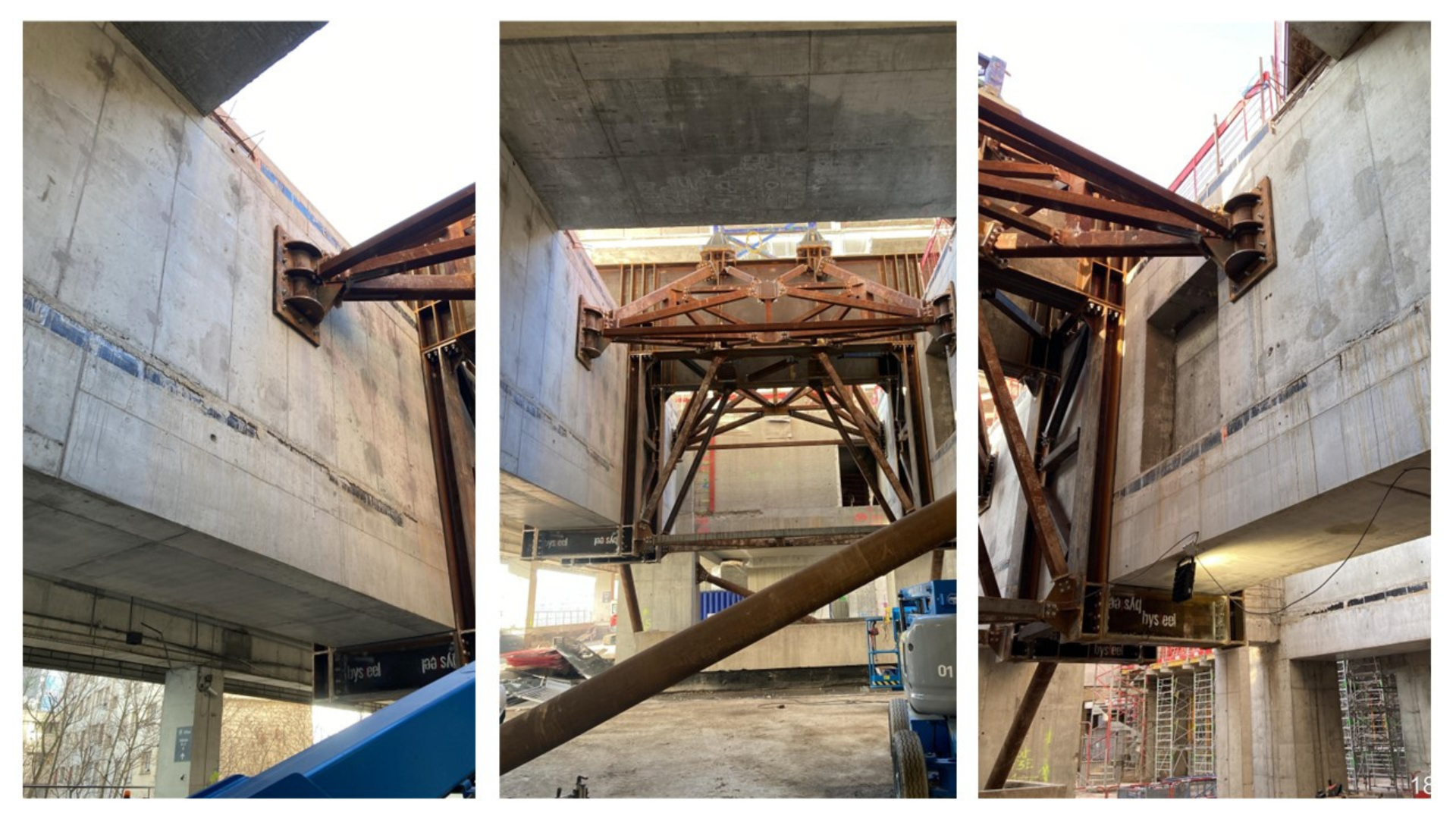 The original building dates from 1980 and is a reinforced concrete structure. In order to enable the rebuild, temporary works were required to support 4No. tower cranes on site. One of the transfer structures had to be able to support a crane over 50 meters tall, with 9,550 kNm of overturning moment combined with 1,325 kN of vertical load at the base.
