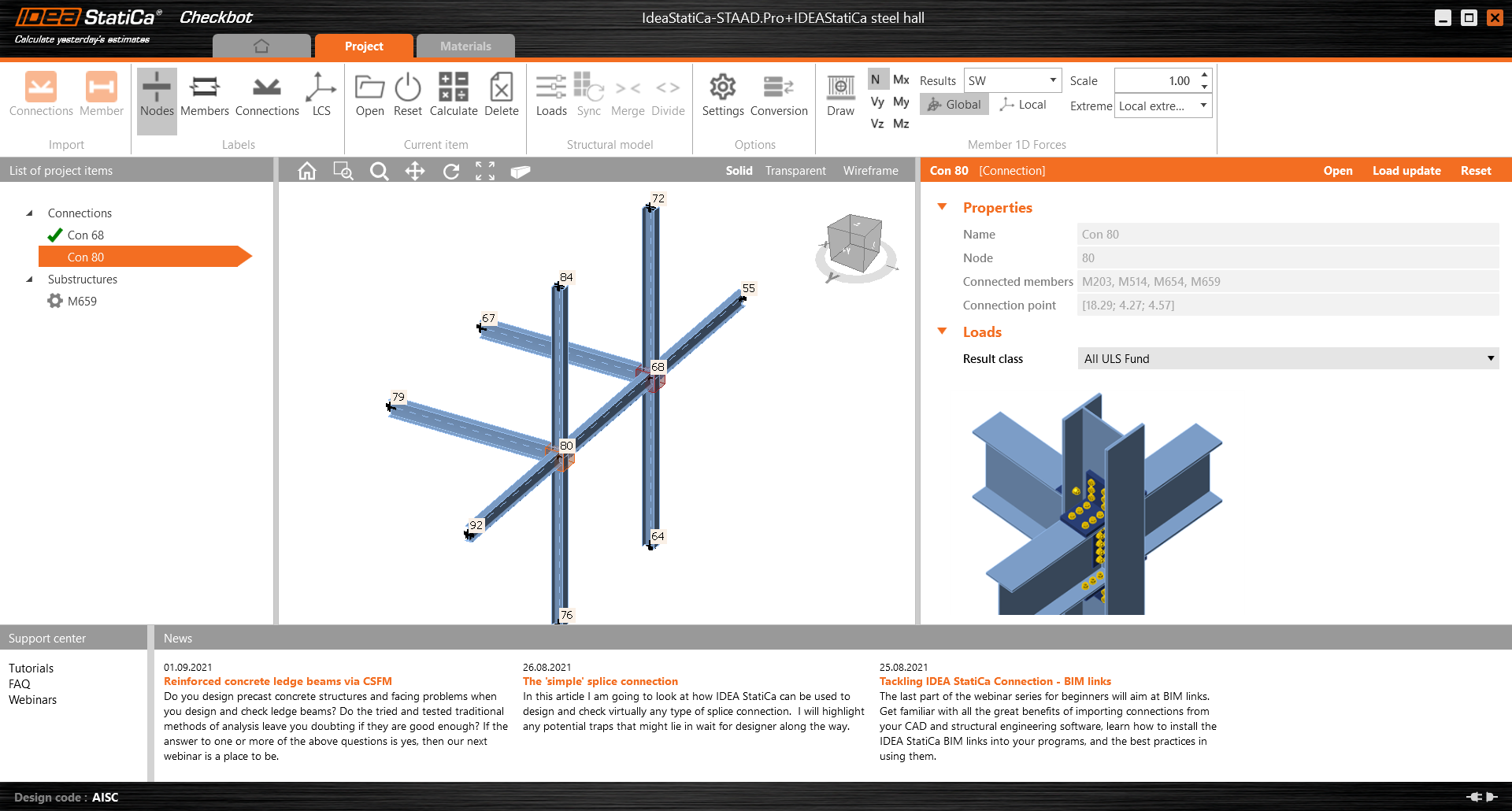 A cena 3D no meio mostra o modelo estrutural 3D (SM), que apresenta as entidades de base no modelo (nós, vigas), itens de projeto (ligações, barras), bem como forças internas (se disponíveis).