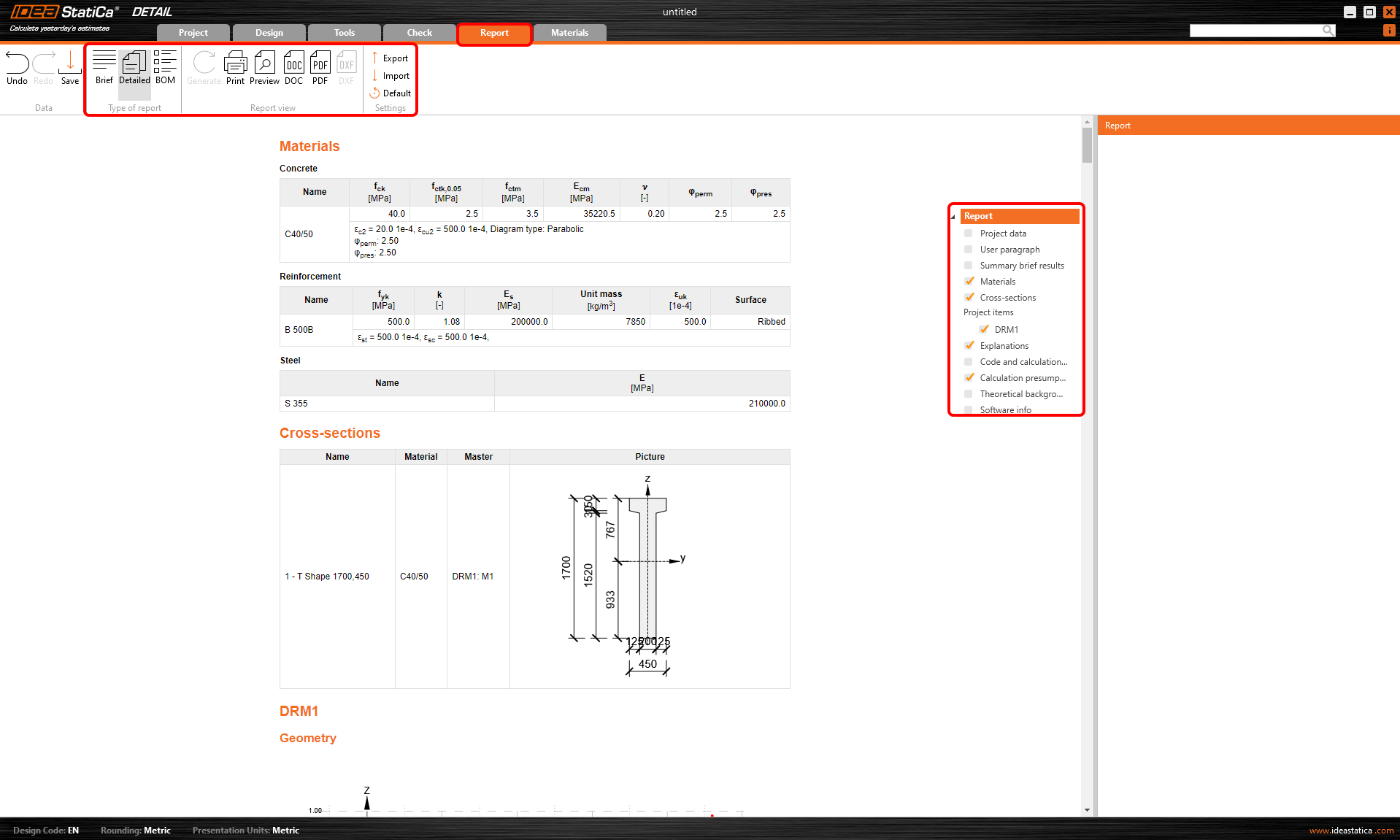 Por fim, vá para o Relatório. O IDEA StatiCa oferece um relatório totalmente personalizável para imprimir ou guardar num formato editável.