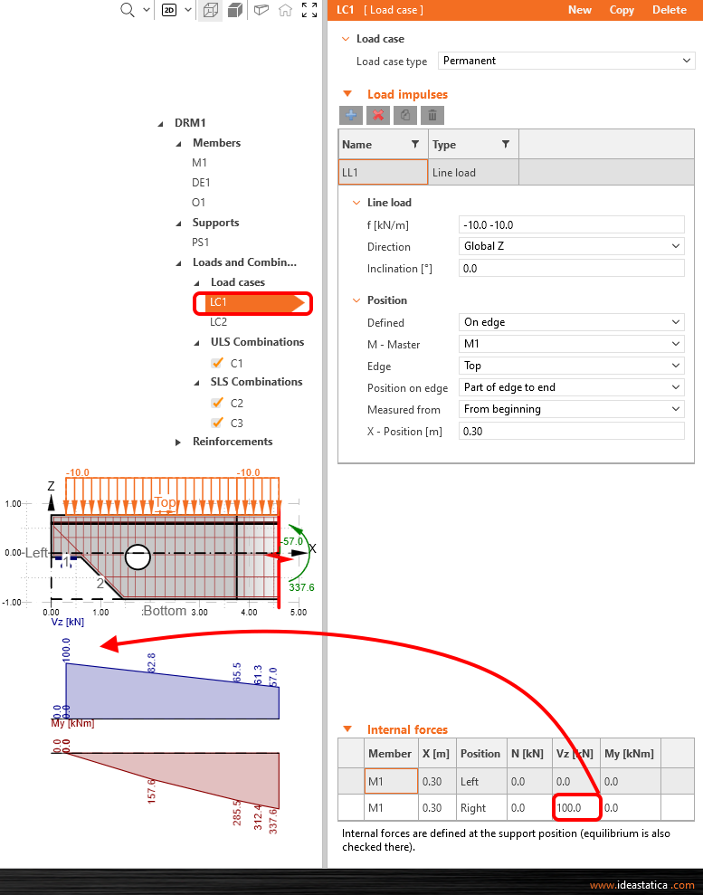 Modificar o caso de carga LC1 para efeitos permanentes. Aplicar a reação como uma força de corte 100 kN Vz a partir da posição correta. Pode ver a alteração no diagrama de forças internas.