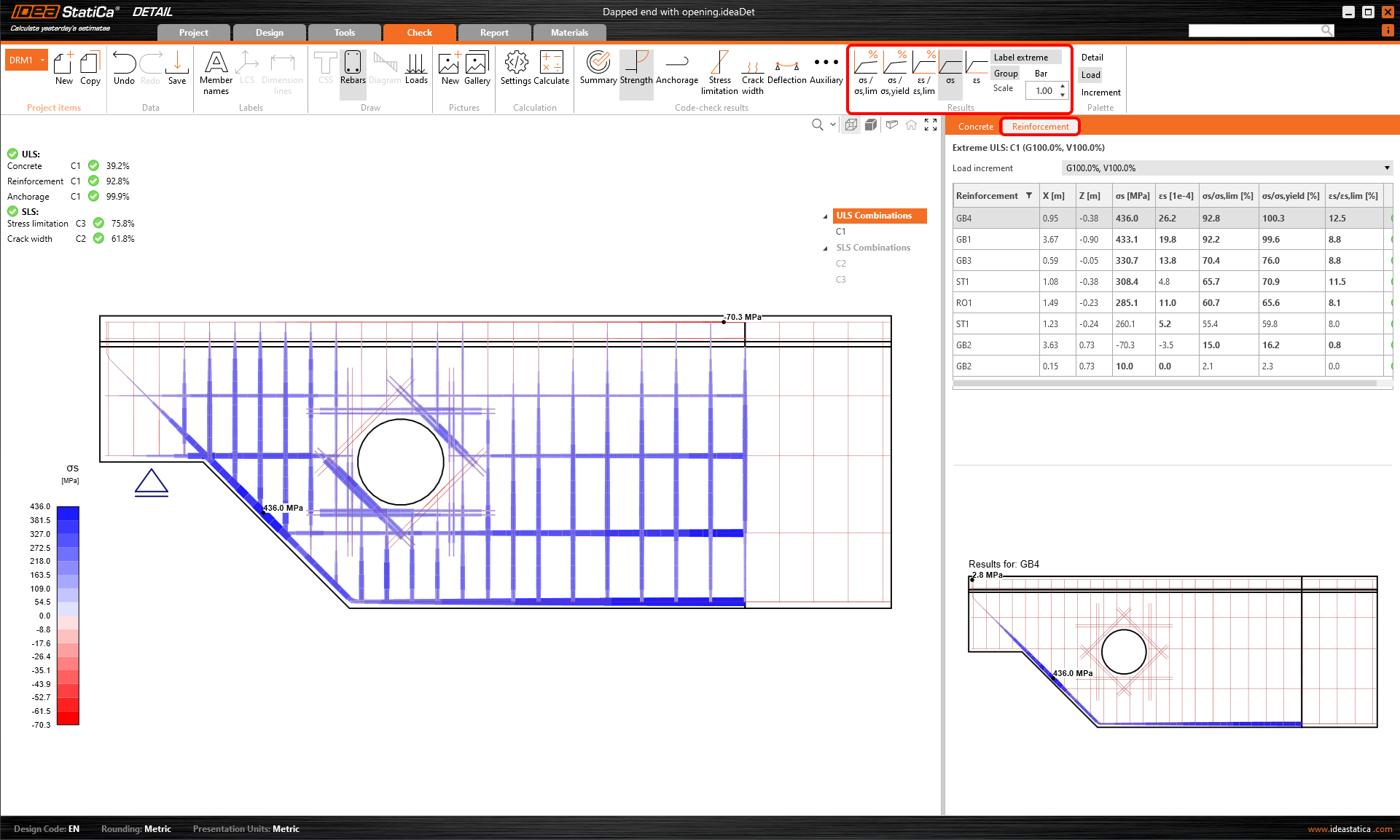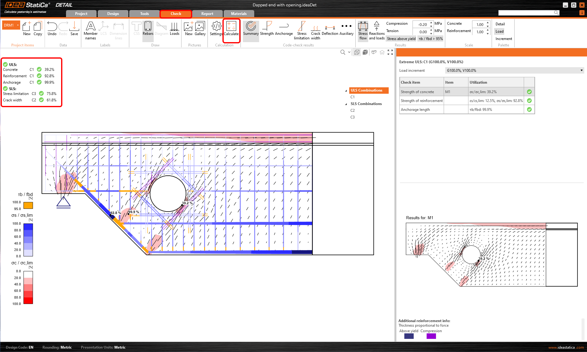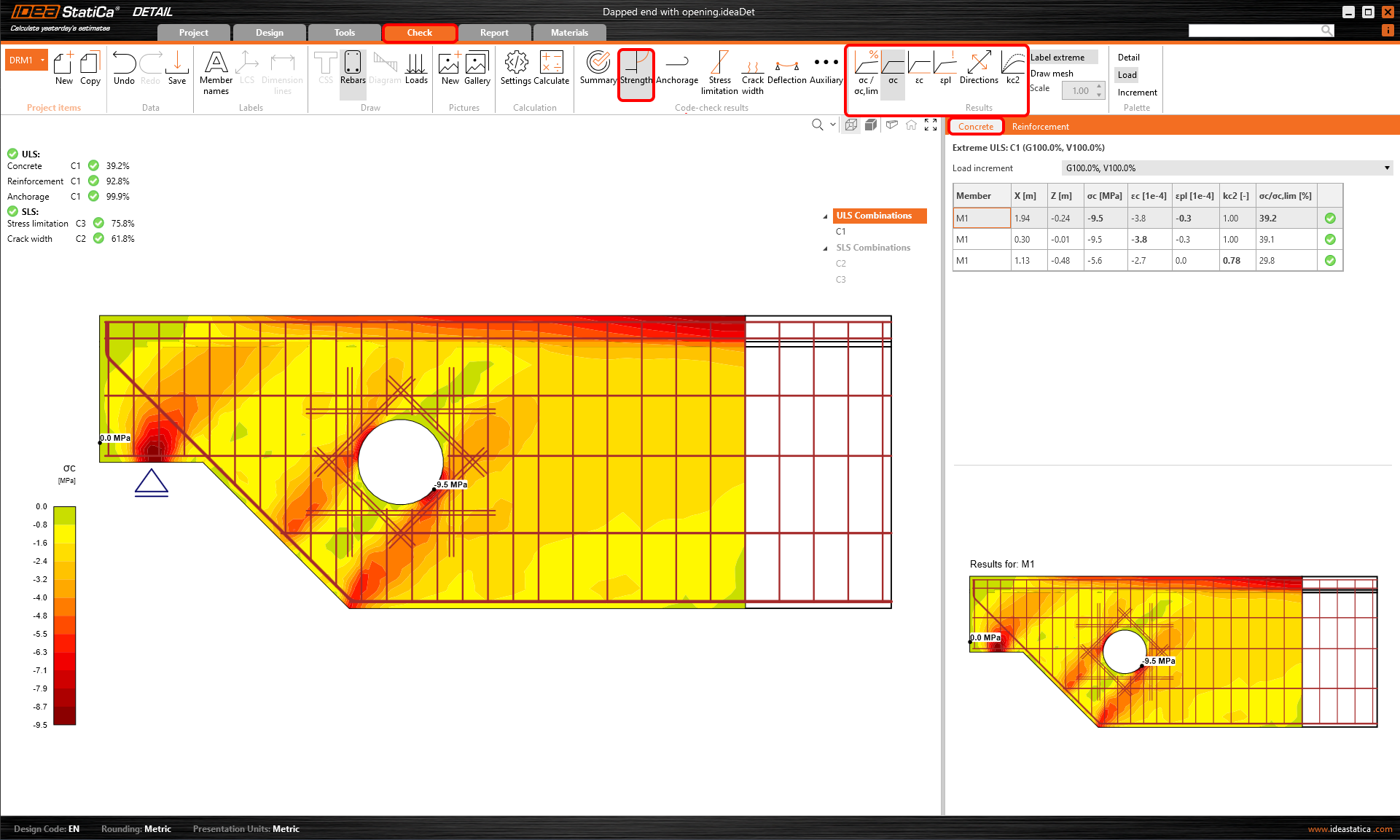 Para passar pelas verificações detalhadas de cada componente, comece pelo separador Resistência. Isto mostrará verificações concretas, tais como a utilização de tensões, tensões principais, deformações e um mapa do fator de redução kc que pode ser alterado no friso.