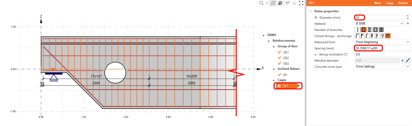 O primeiro item ST1 é utilizado para modelação de estribos. Modifique o diâmetro dos estribos para 10 mm e altere as distâncias entre estribos para 50 2500/17 a200. Como se pode ver, é possível combinar várias definições de distâncias. Isto significa que o primeiro estribo é posicionado a 50 mm da borda, depois preenchemos 2,5 m por uma divisão de 17 e preenchemos o resto por 200 mm de distância.