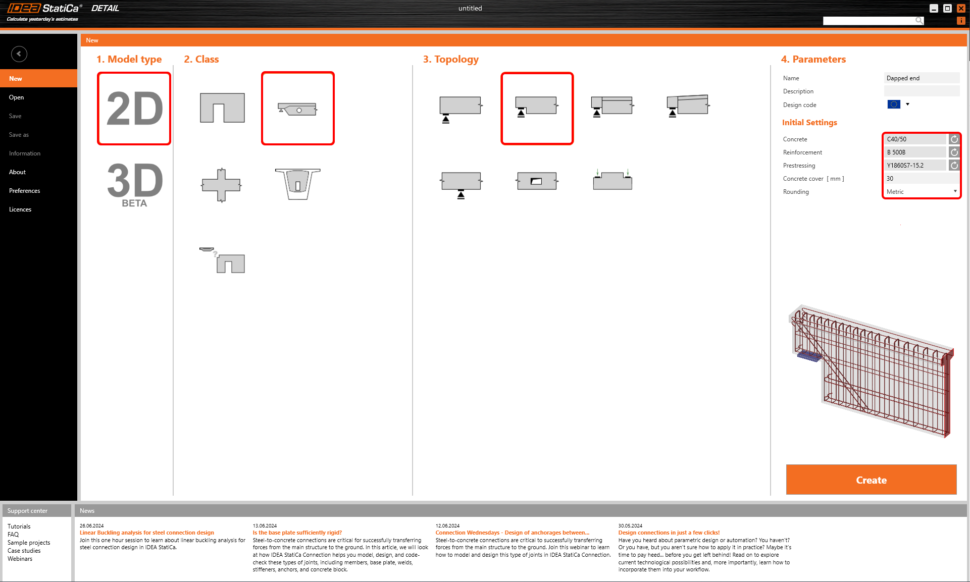 Comece por lançar o IDEA StatiCa e selecione a aplicação Detalhe. Para criar um novo projeto, pode começar com uma seleção de betão adequado de grau C40/50 e um recobrimento de 30 mm. Em seguida, continue com a topologia das Bar ras 2D. Nos modelos Members 2D, selecione Dapped end, one css.