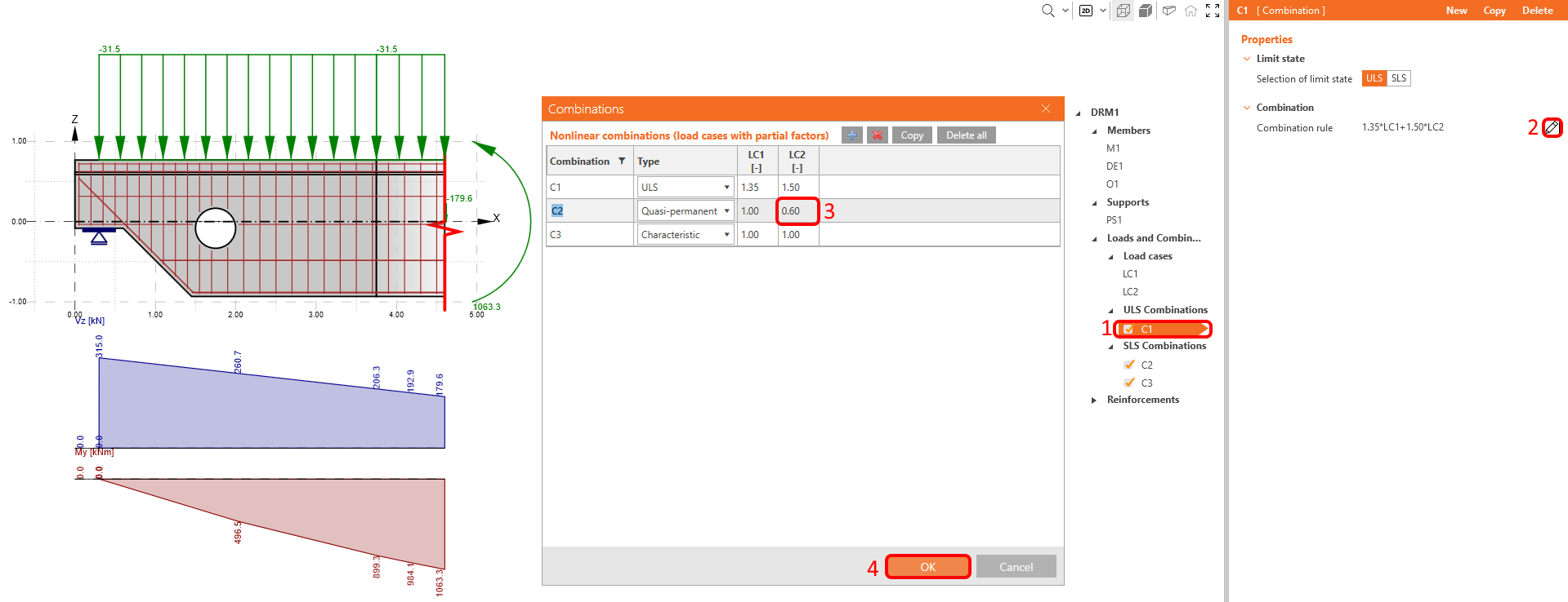 Dois casos de carga e três combinações não lineares foram automaticamente adicionados pelo software. São necessários dois casos de carga para distinguir entre cargas permanentes e variáveis e três combinações para cobrir uma combinação ULS e duas combinações SLS (Caraterística e Quase-permanente) para todas as verificações.