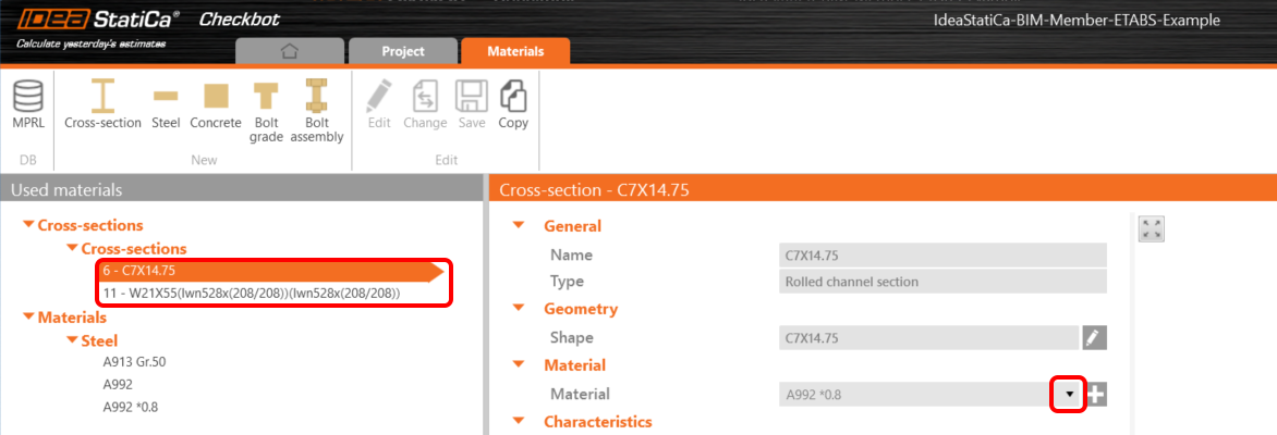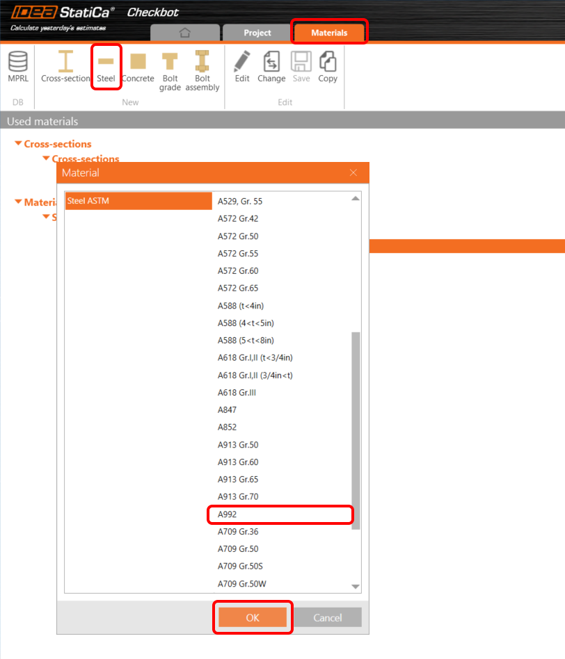 First, add the new steel grade to the project's tab Material. Select steel A992.
