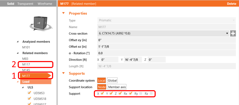 For the realistic behavior of the related members, restrict the supports of 177 and 117 to X, Y, Z, and Rx.
