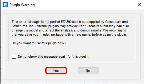 Start ETABS and click Tools > Add/Show Plugins to open the Plugin Manager dialog. This option lets you install add-ins (programs) to the appropriate places in the ETABS menu.