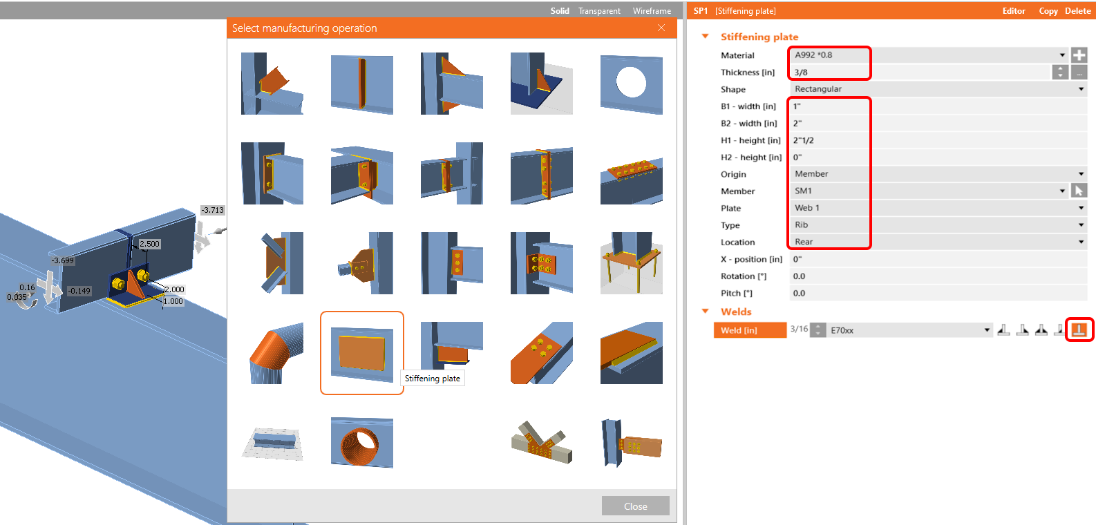 Now add a Stiffening plate to the joint with the following values.