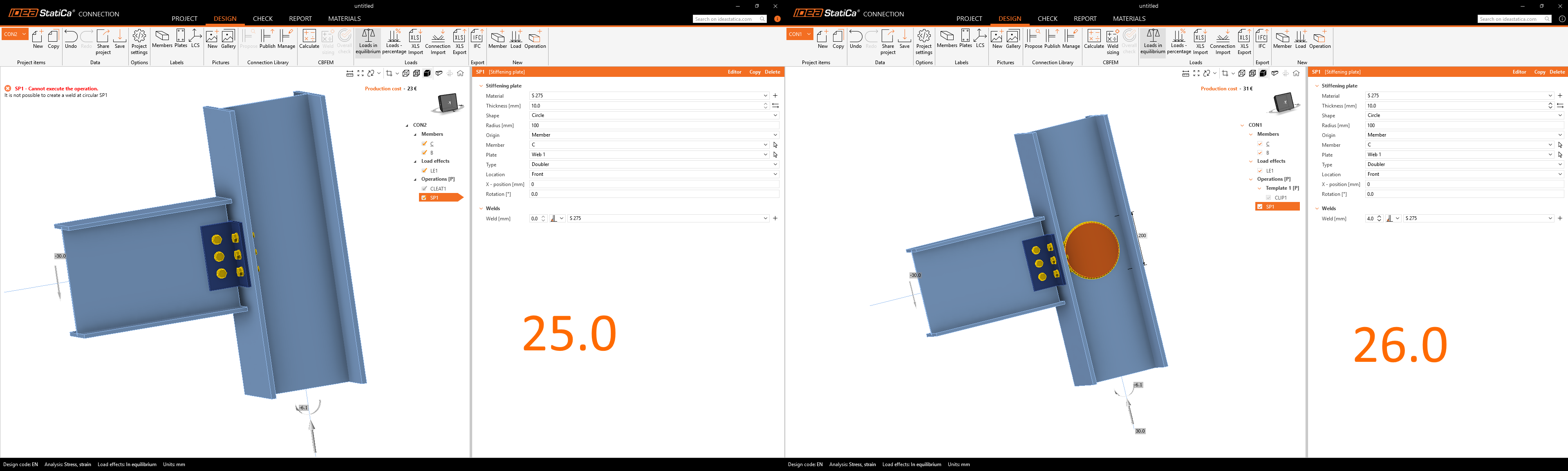 It is now possible to define a circular stiffening plate, and with the type set as Doubler, weld it to a member plate or single plate with a fillet or butt weld.