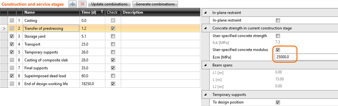 A possibility to specify elastic modulus of concrete in a construction stage – Transfer of prestressing is now added. The whole logic is an analogy to user-specified concrete strength available for some time now. Once user set this value, IDEA will recalculate equivalent age of concrete member and allow this situation by the code exception, when you test and verify elastic modulus value.