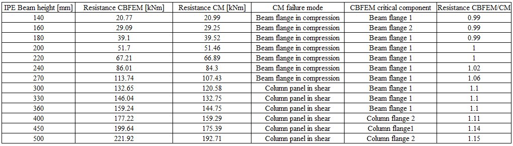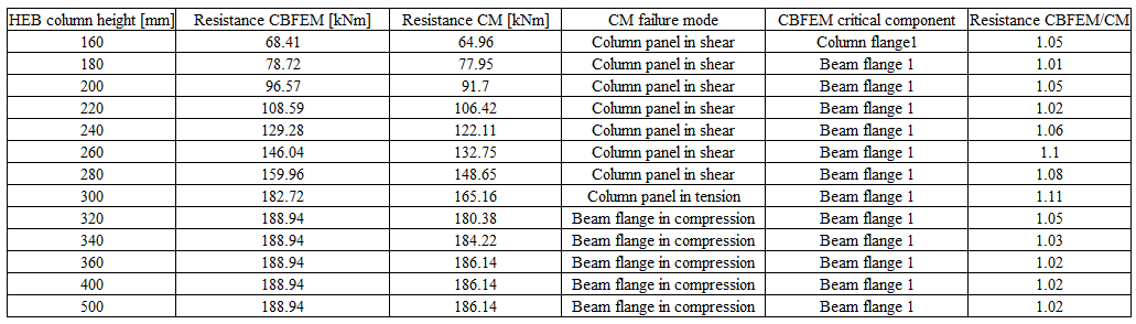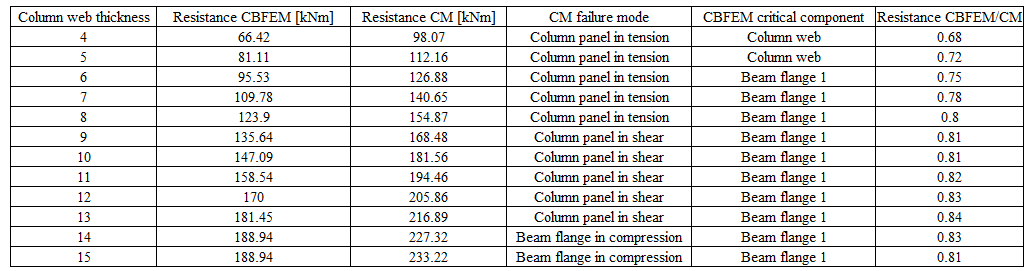 The results calculated by CBFEM are compared with CM. The comparison is focused on the design resistance and the critical component. The study is performed for three different parameters: beam cross-section, column cross-section, and thickness of the column web panel.