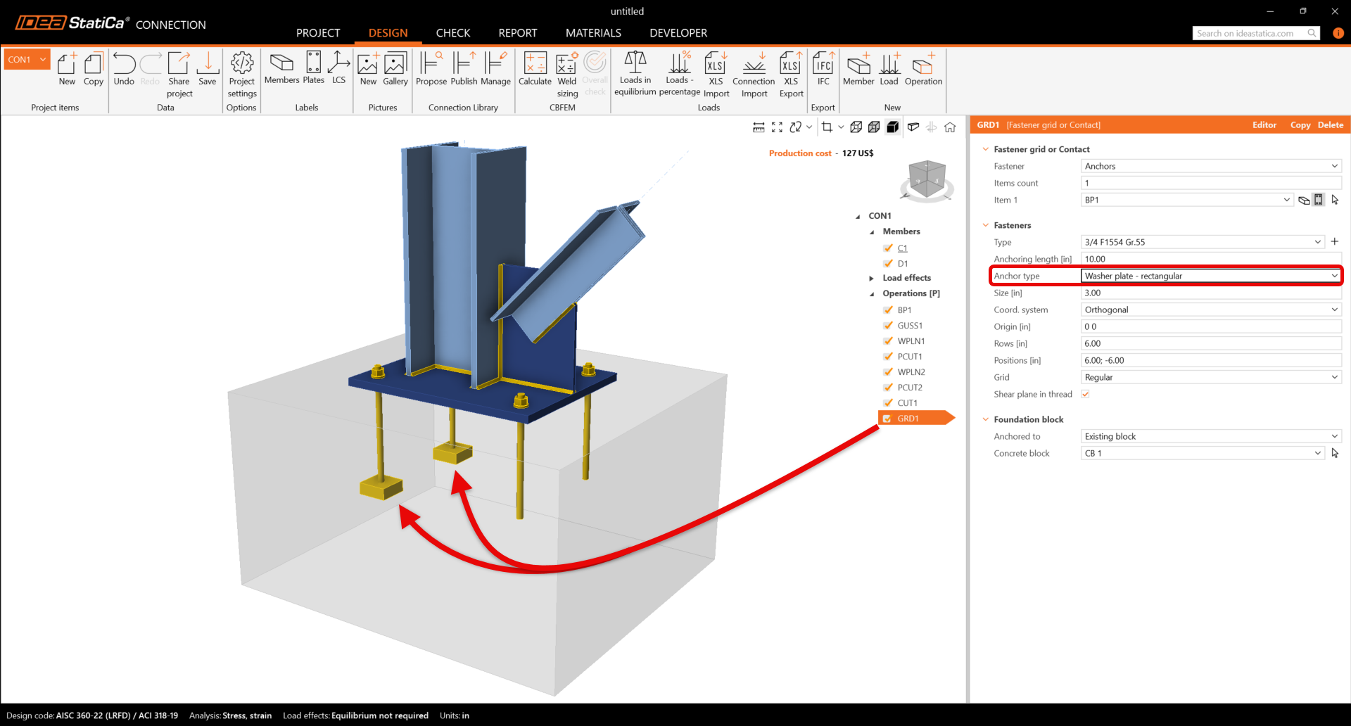 In IDEA StatiCa Connection, you can model customized base plates and anchor arrangements. In cases where you need to model a combination of existing cast-in-place anchors and newly proposed epoxy anchors, because they are still close to the base plate, you can set them up in IDEA StatiCa as follows: