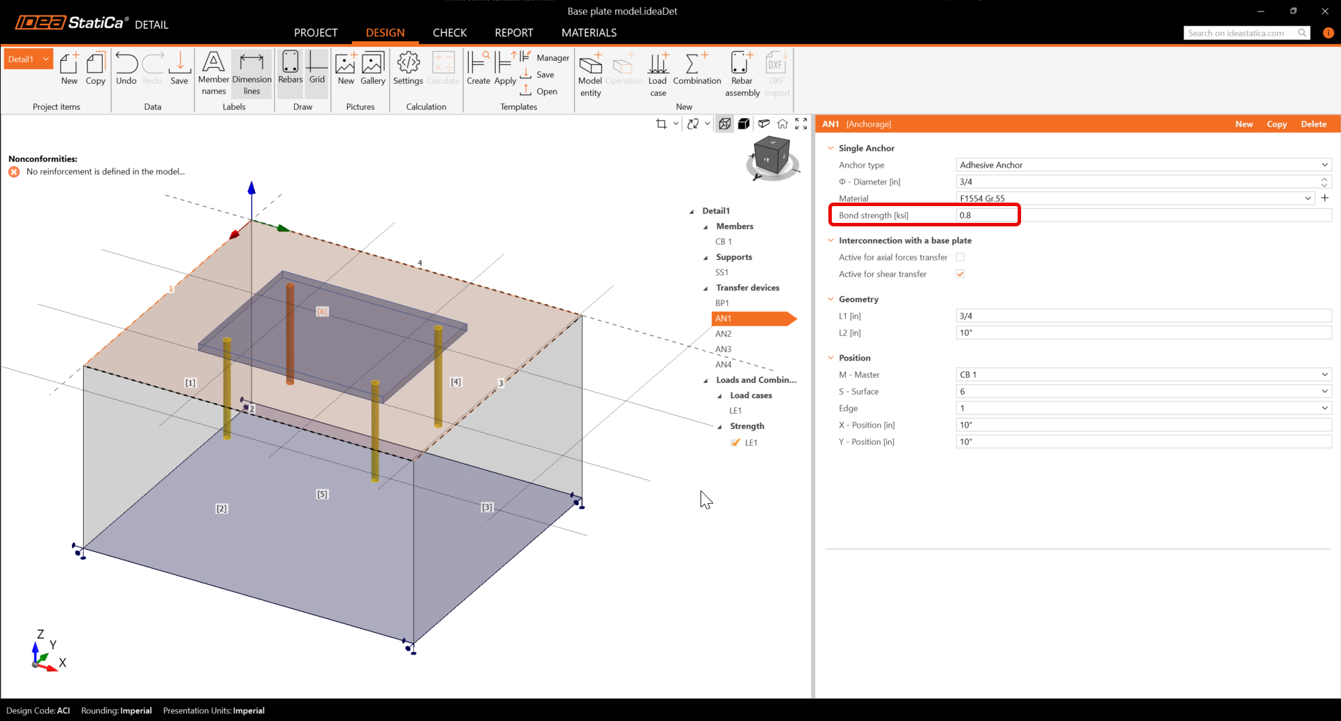 In Detail 3D, verify the epoxy anchors by entering the specified bond strength from the manufacturer’s data sheet.