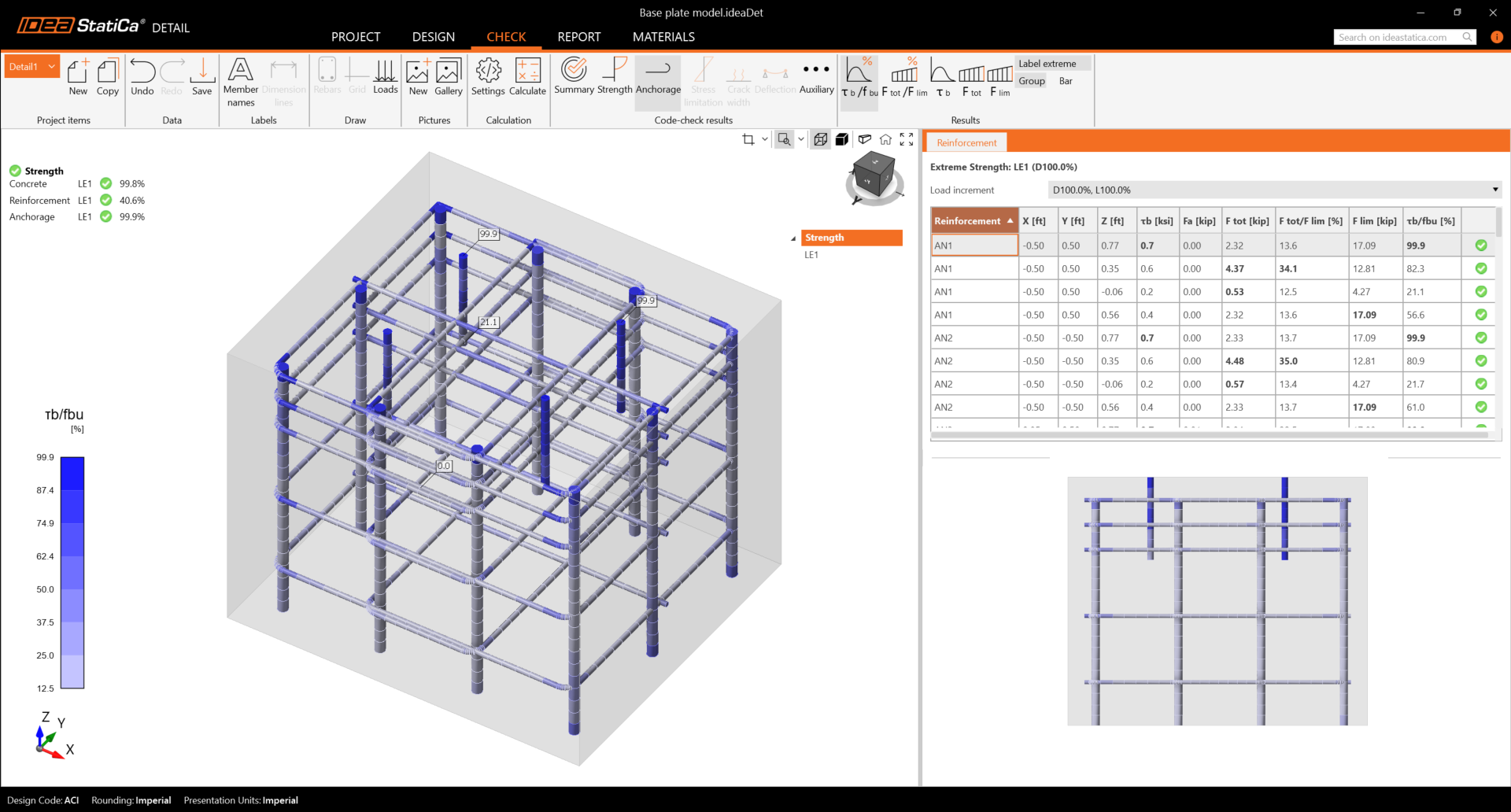 Run the analysis to review detailed results such as stress flows, concrete compressive strength, steel reinforcement tension strength, bond strength, and other parameters critical for ACI 318 anchoring checks.