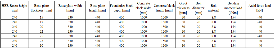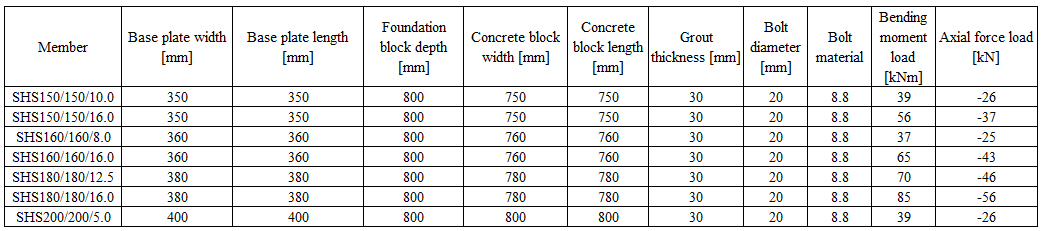 The verification is prepared for base plates with different cross-sections and dimensions. Examples overview is shown in Tab. 10.3.1-10.3.3. Joints geometry are shown in Drawings 10.3.1-10.3.2. Steel grade for all of the examples is S235. Concrete grade is C20/25. The member is connected to the base plate by fillet welds, aw=8mm. The results of the verification are shown in Tab. 10.3.4-10.3.6 and in Fig. 10.3.3.-10.3.8.