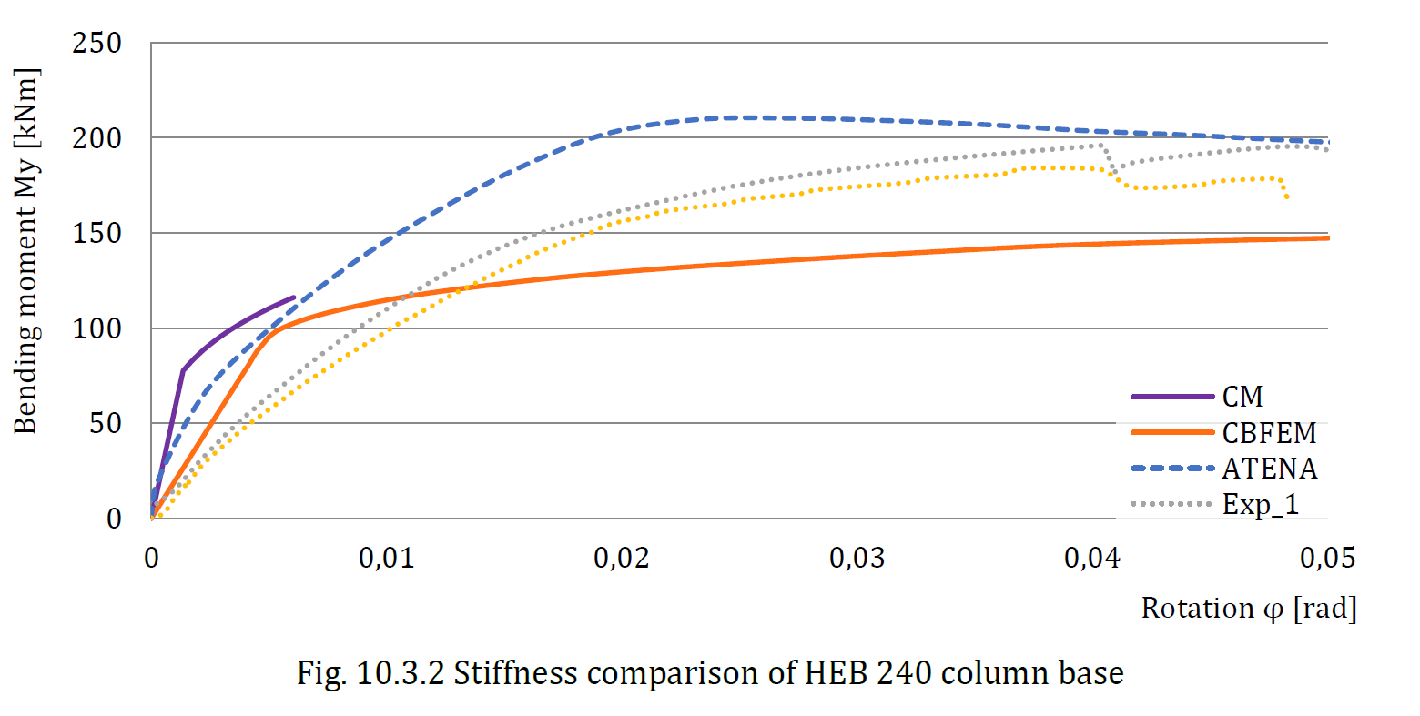 The comparison of moment-rotational diagrams predicted by design-oriented models, CM and CBFEM, and research-oriented model by ATENA code to the experimental results is in Fig. 10.3.2.