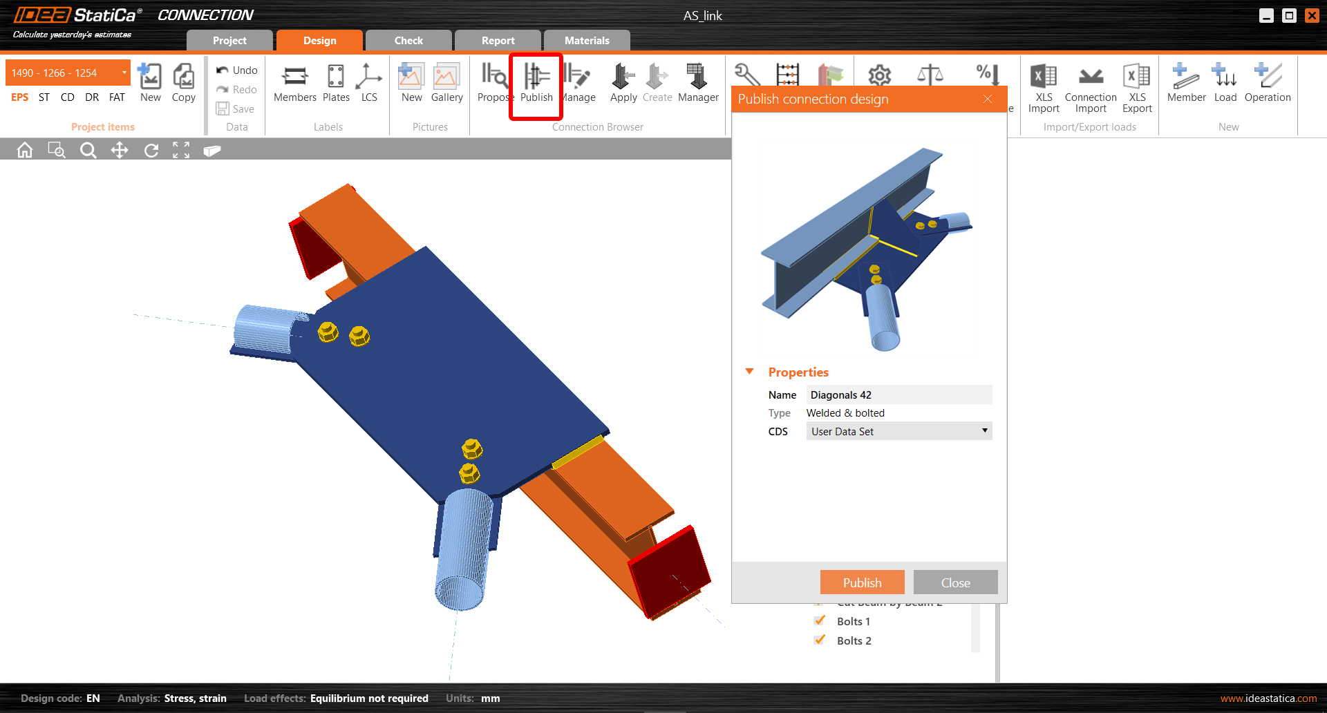 You can now add any created custom design into the library by selecting the Publish command from the ribbon. In the following dialogue, you can specify the Connection Design Set (CDS) where the design will be saved.  At the moment, the design will be included into the user's private library – User Data Set. More will come in future versions of IDEA StatiCa (the possibility to share the designs, etc.).