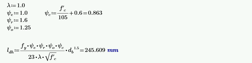 From the figure, it can be estimated with certainty that the reinforcement will be fully developed in the critical section of the beam. However, let's verify this. For the standard hook, the calculation in ACI 318-19 Section 25.4.3.1 should be used.