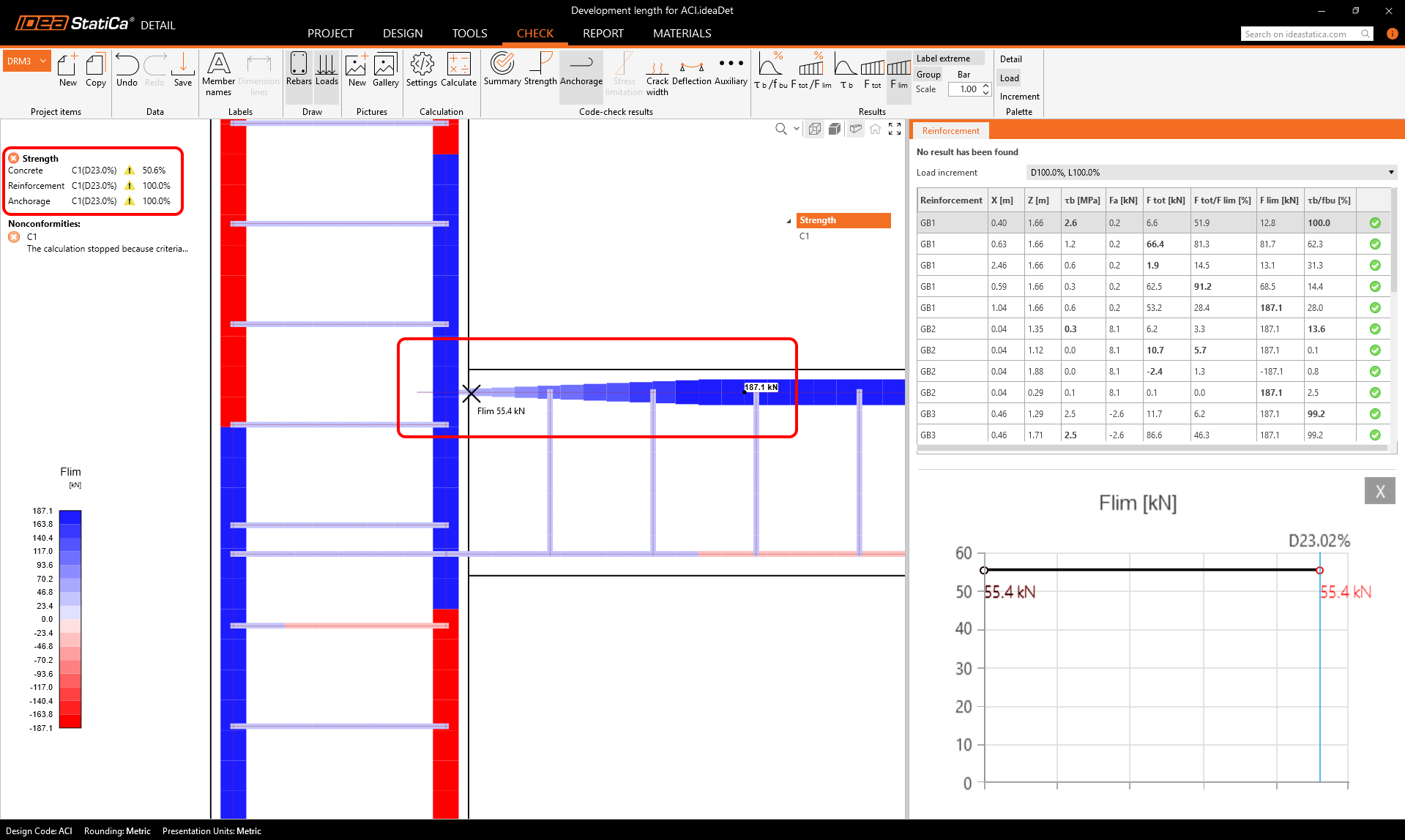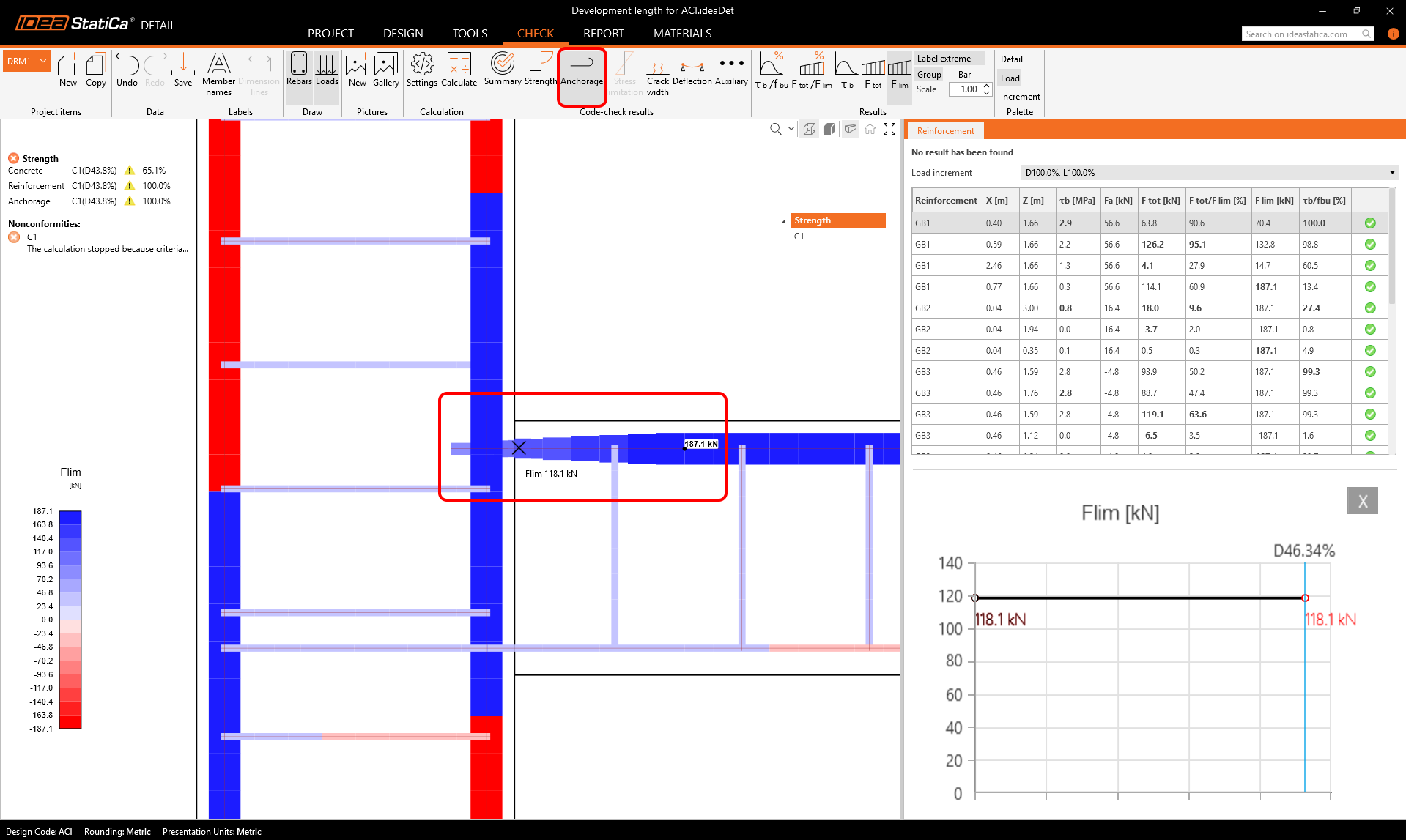 This is obviously due to the fact that the reinforcement is not fully developed at the critical section. Now the question is where to display the development length for each reinforcement in the application. If we look in the Anchorage tab, we find the Flim variable in the ribbon.