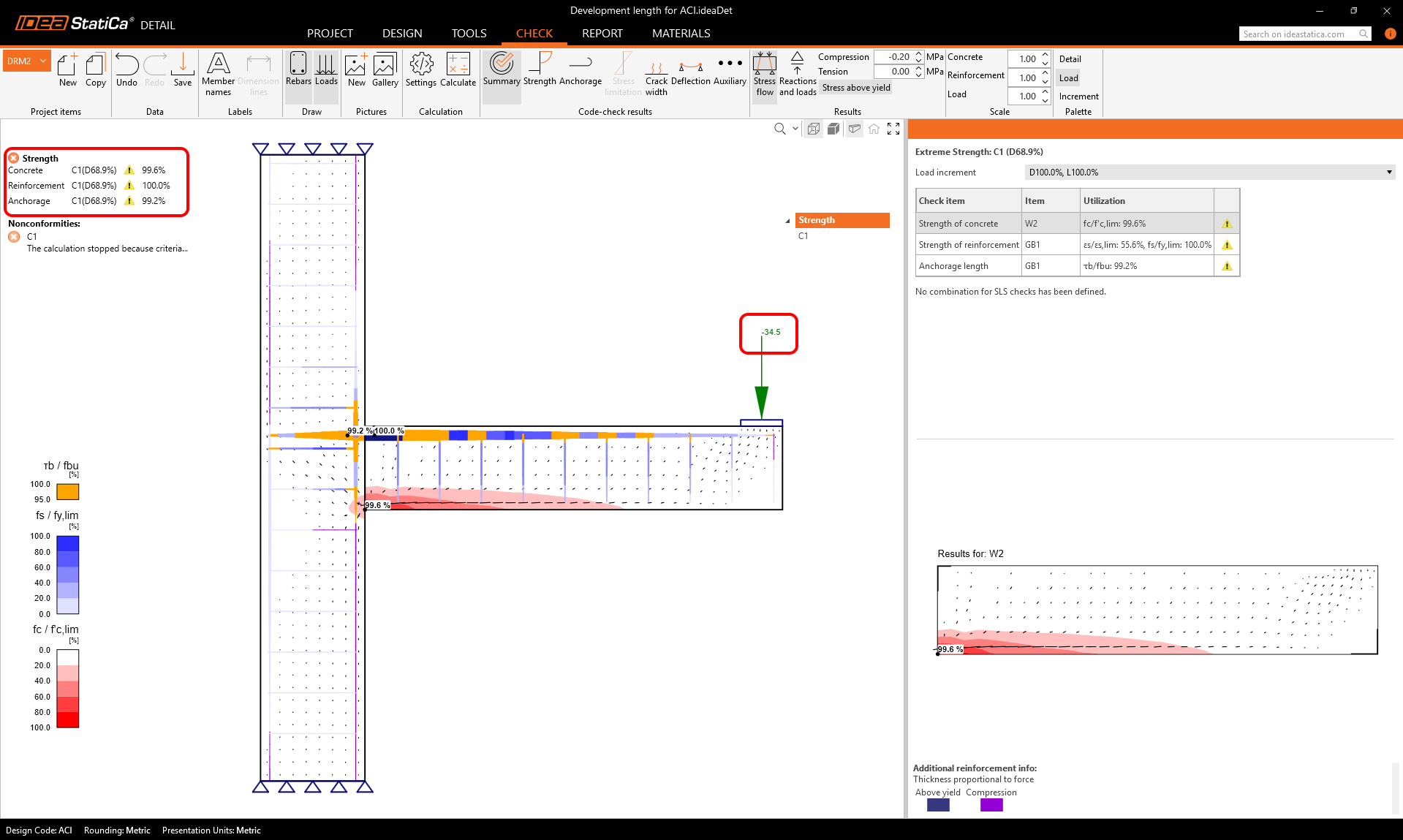 IDEA StatiCa Detail code check reinforced concrete using CSFM. The code check consists of strength utilization ratios. One of them is an anchorage check related to verifying the development length required by ACI. In this article, it is shown how to correlate the Detail results to ACI 318-19 Ch.25