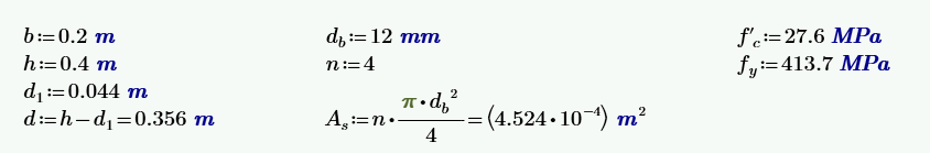 The horizontal beam has a rectangular cross-section with dimensions 400 x 200 mm. The reinforcement under consideration is 4 bars of 12 mm diameter. The strength of concrete and steel, with other input parameters, is shown in the following figure.