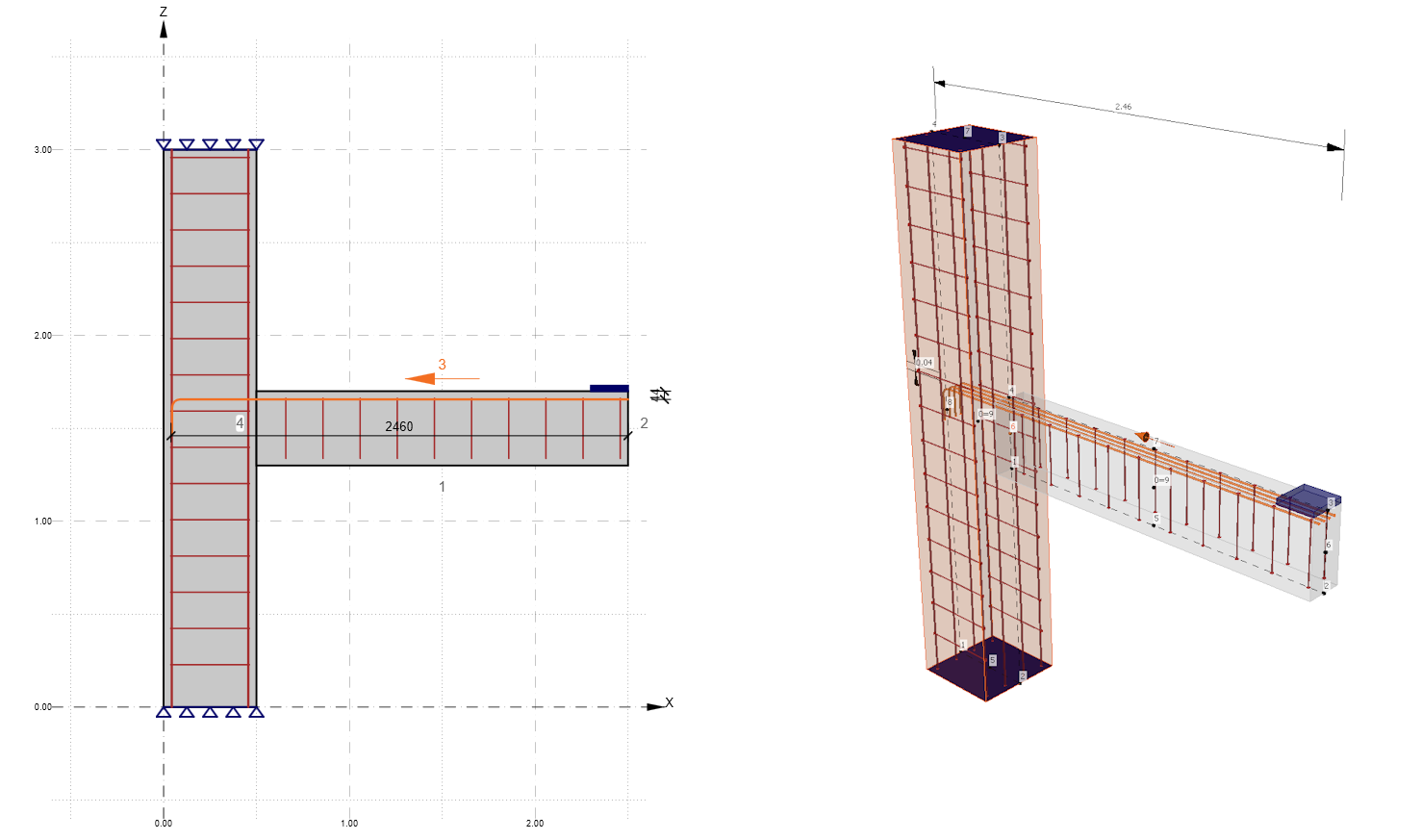 We will explain how exactly development length works in the IDEA StatiCa Detail application using this simple example. We will examine a selected reinforcement of a horizontal beam that is terminated in a column.