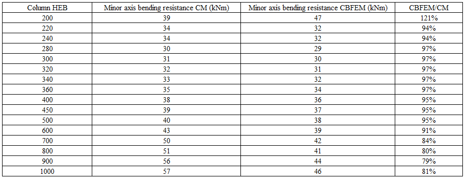 \[ \textsf{\textit{\footnotesize{Fig. 5.3.3 Comparison resistance of end plate minor axis connection predicted by CBFEM and CM}}}\]