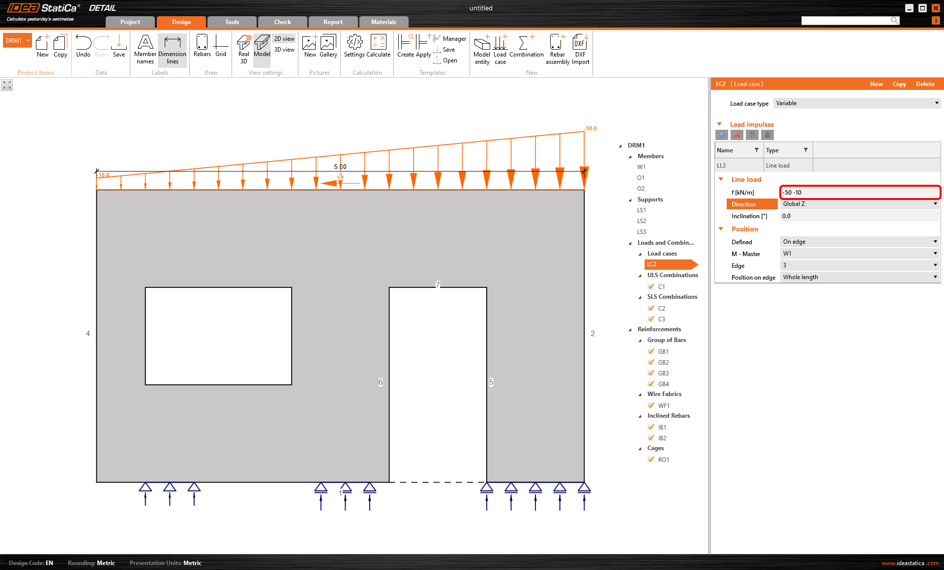 Line load can be defined as uniform or trapezoidal. The used type depends on the numerical load definition. When applying the linear line load, simply enter only one value to the corresponding cell in the data window. Nevertheless, if you need to specify the trapezoidal load, fill in values at one and the other end of the load. See the practical examples: