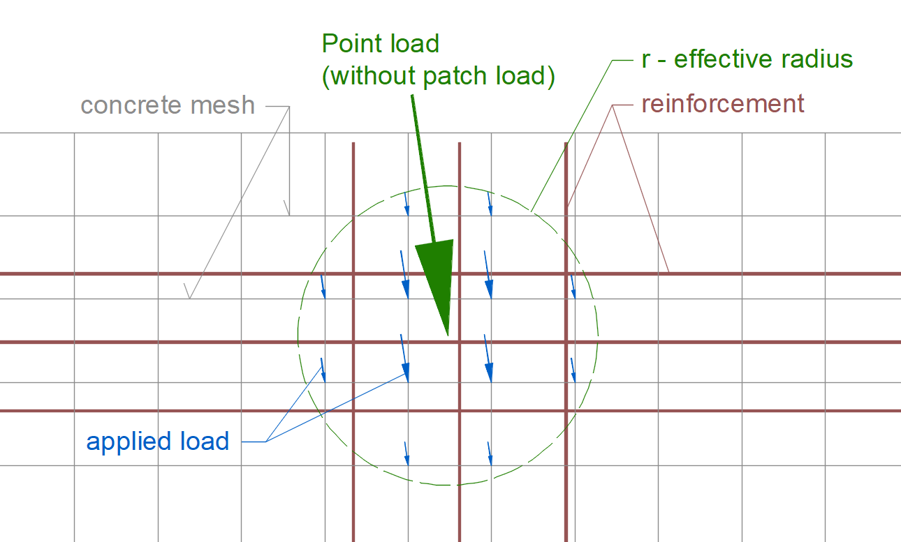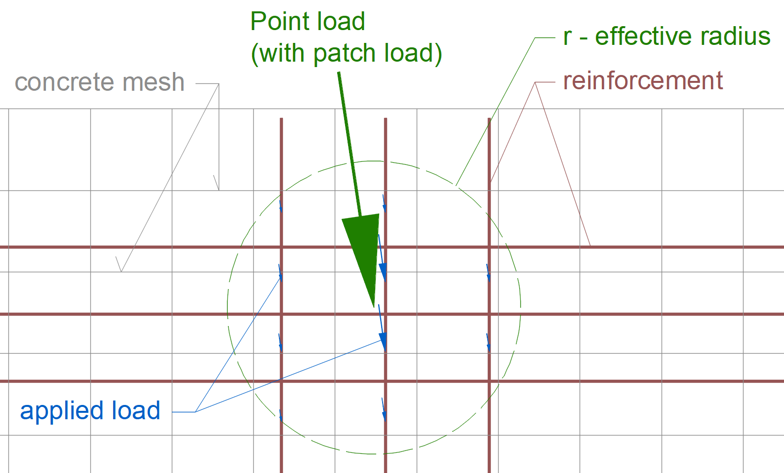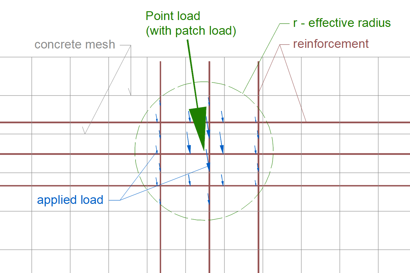 The main principle is that point loads are applied to the model by elastic links with different stiffnesses. The stiffnesses are evaluated by weighted averages based on the length of the links. These links are connected to the points of the concrete or reinforcement mesh (where the blue arrows were drawn) and transfer the loads to the structure.