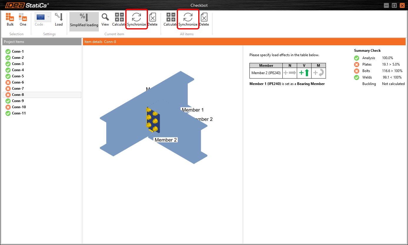 Connections that did not pass the code-checks can be modified in the Advance Steel model, synchronized and recalculated. The Synchronize function updates the model data such as plate thickness, position and amount of bolts, weld size, etc. You can either synchronize and calculate one selected joint or the whole list at once.