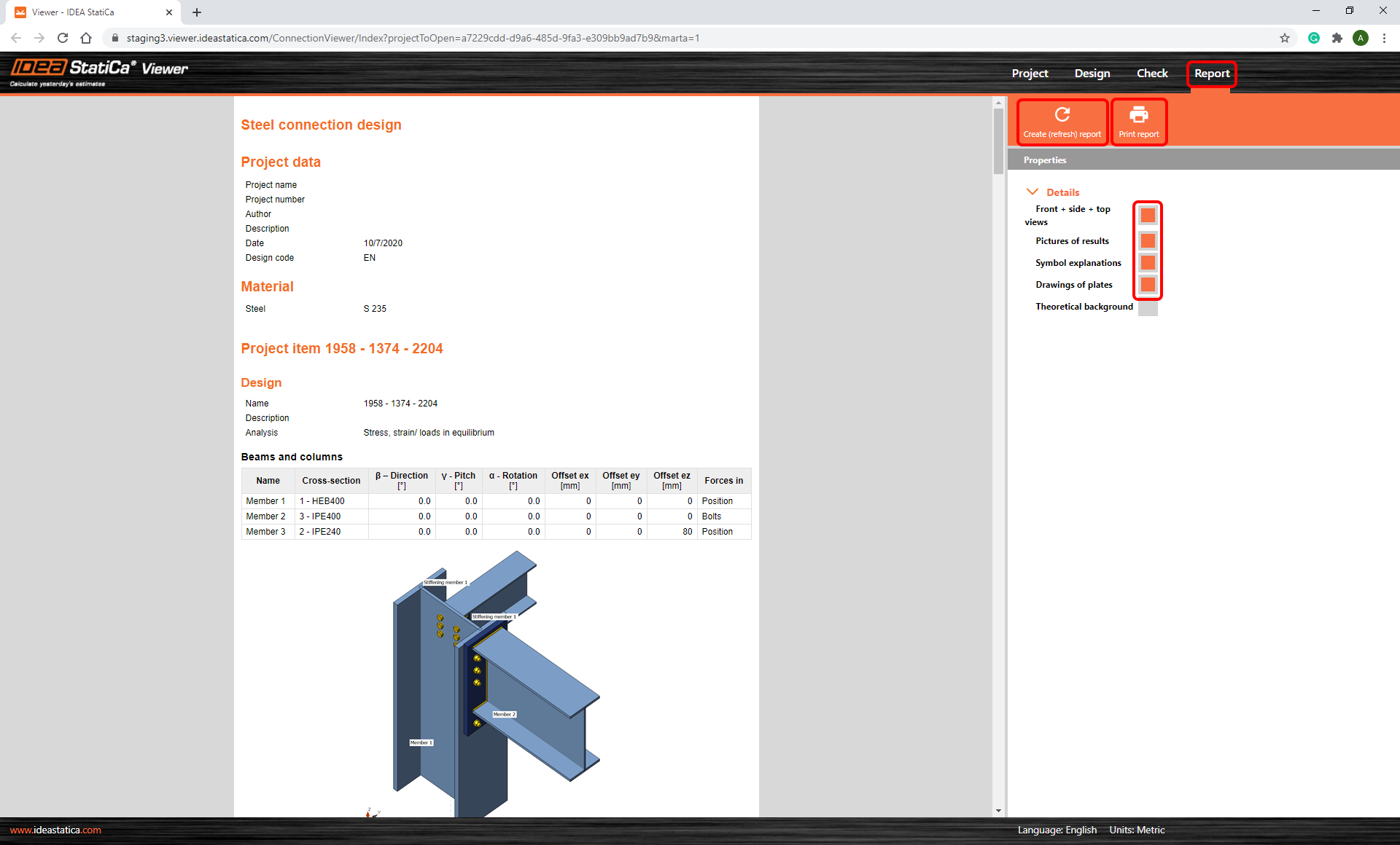 To see the details of the CBFEM analysis and to print out the report, click on the command View to open the connection in the browser application IDEA StatiCa Viewer.