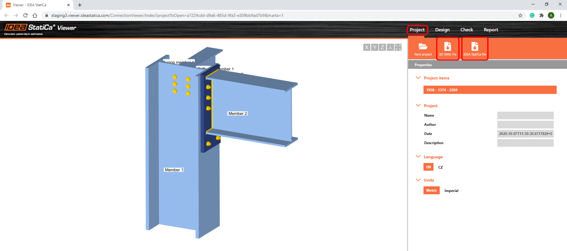 In the Viewer tab Project, you can also download the IDEA StatiCa file for the desktop application Connection and generate a 3D DWG file of the single joint.