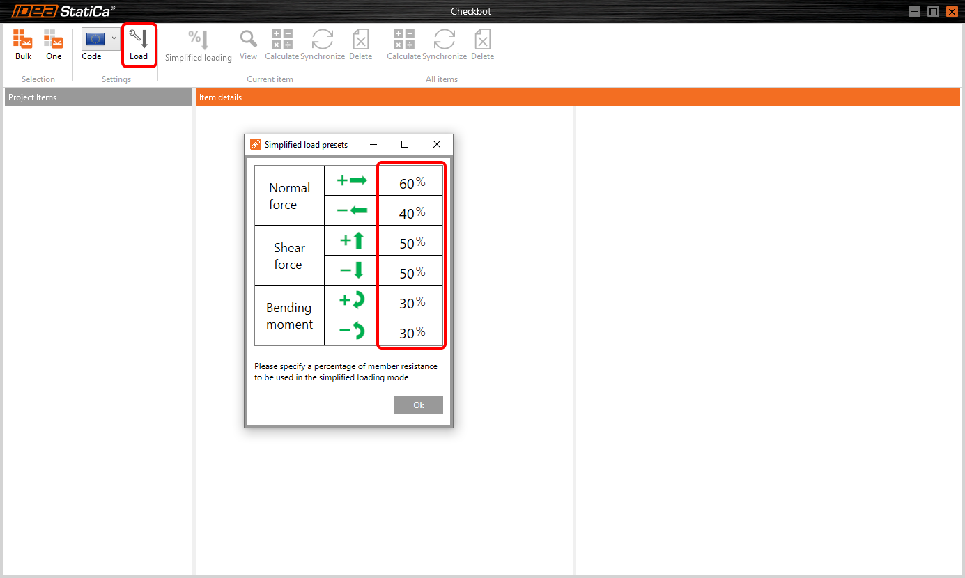 All connections are imported to the Checkbot tab. Select each joint in the list and activate the design load scenario of the simplified loading by clicking on the internal forces symbols. Clicking repeatedly switches the directions of the acting forces. The bearing member is selected automatically.