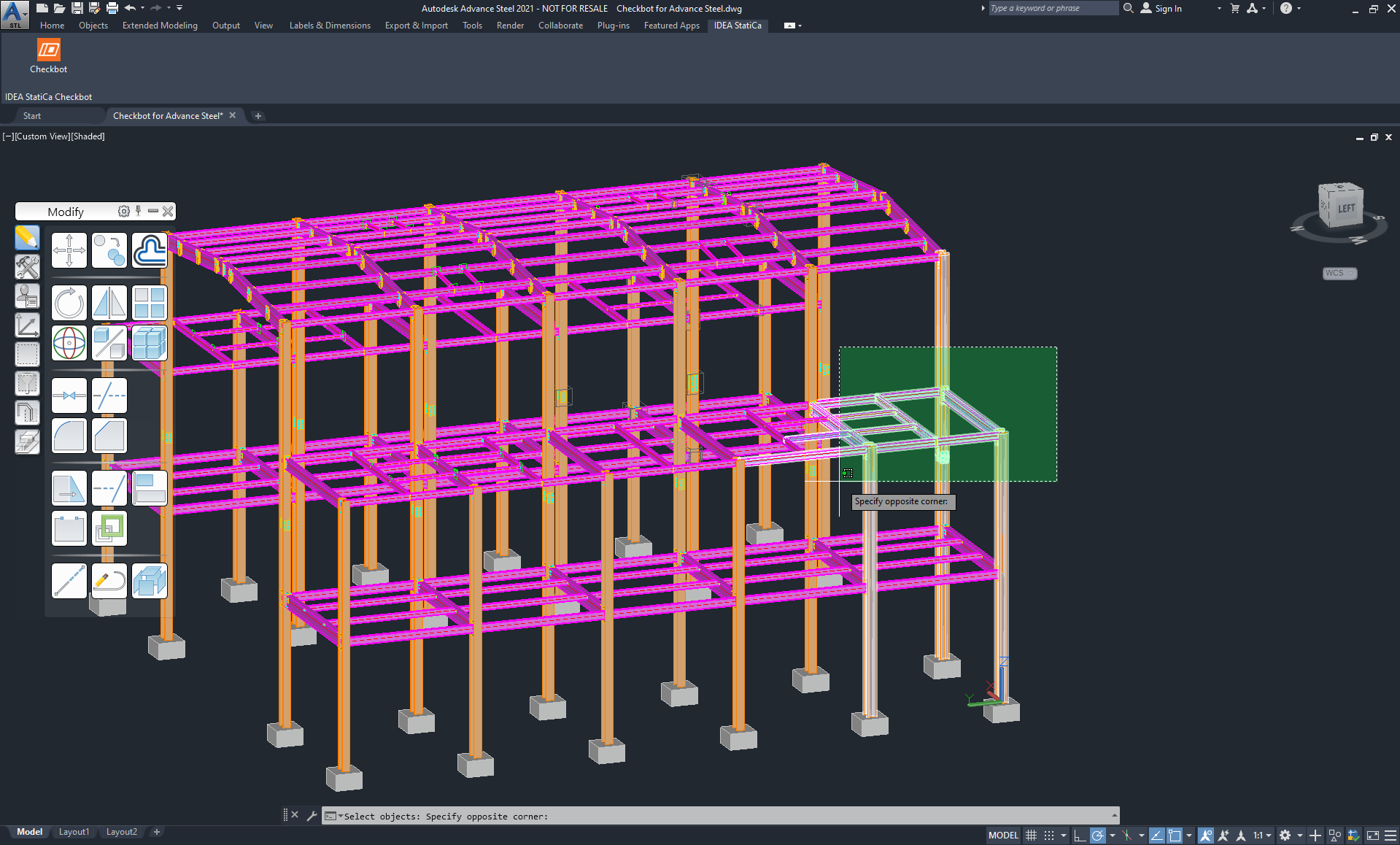 Open the attached project (below this tutorial) in Advance Steel. Then choose IDEA StatiCa in the upper ribbon and open the Checkbot.
