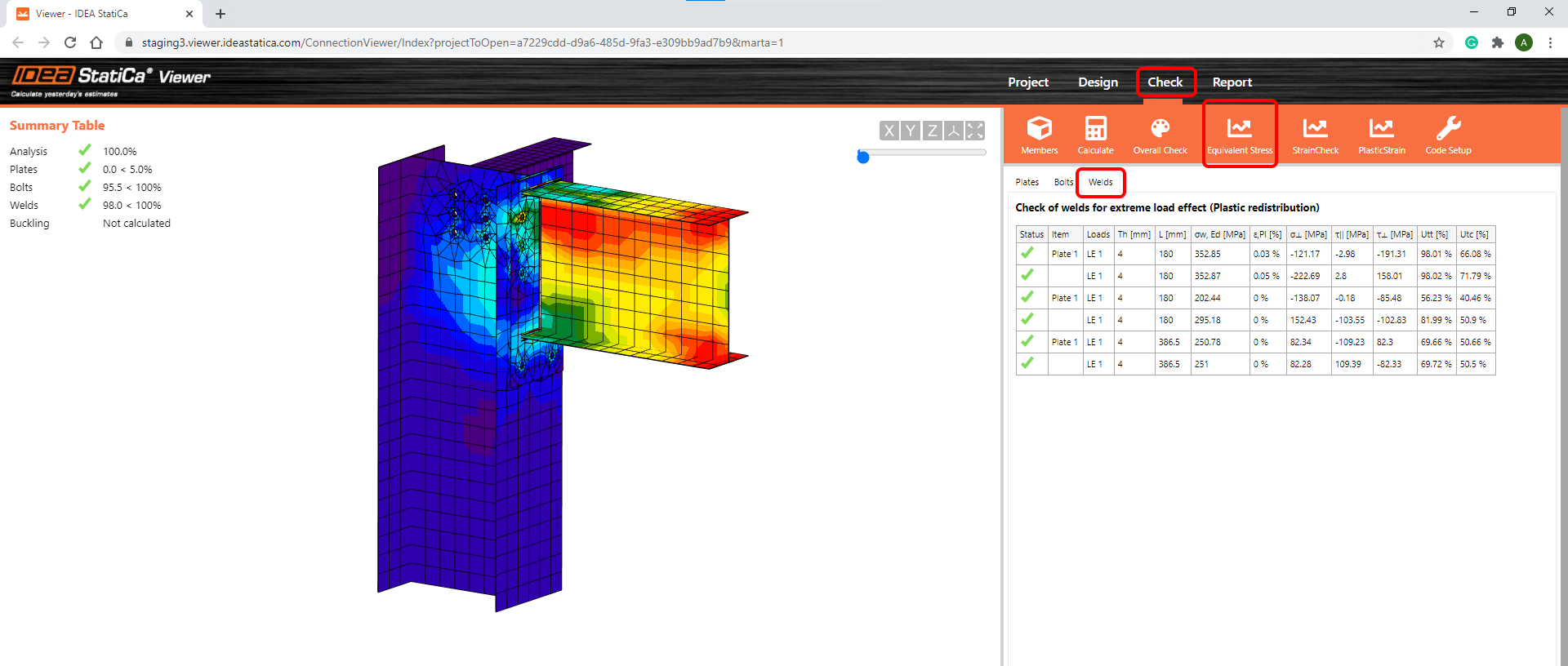 In the Viewer tab Check, you can browse the detailed results e.g. for welds as well as display the stresses and strains in the connection.