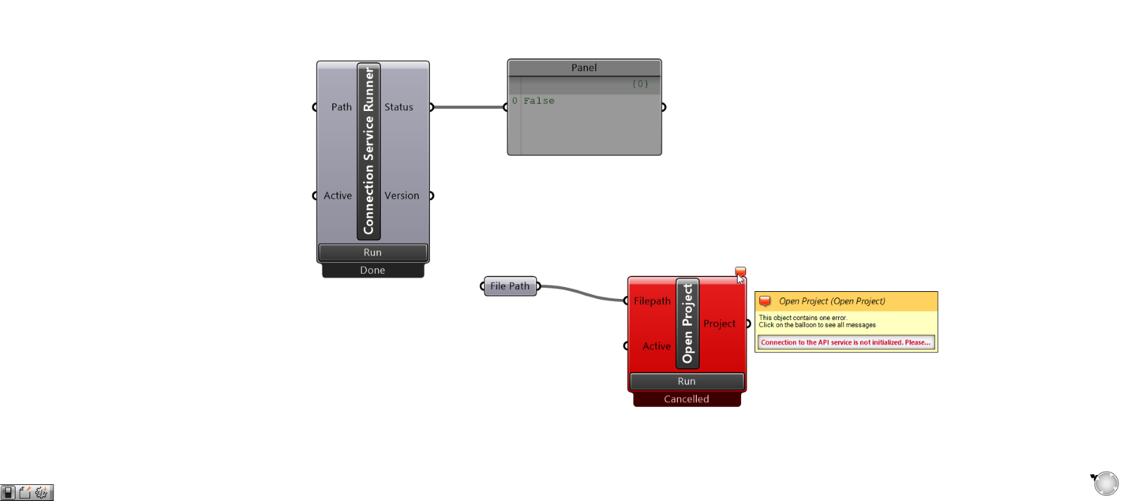 Similar to other API clients, you can connect the Grasshopper script to a runner API instance (Connection Service Attacher) or start the service within Grasshopper (Connection Service Runner). A user must select one of the above components and run it before any of the API components can run.