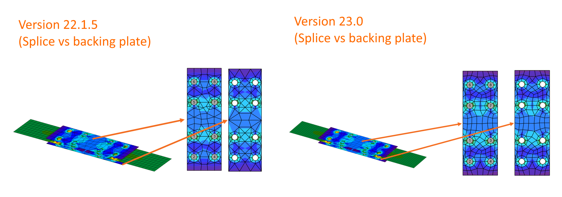 We have also programmed the newest mesh generation rules to ensure better distribution in all plates. Connections composed of splice and backing plates, intermediate stiffening members, or stiffening plates used as custom end plates are tuned for even higher precision of analysis and match better with other parts of the connection.
