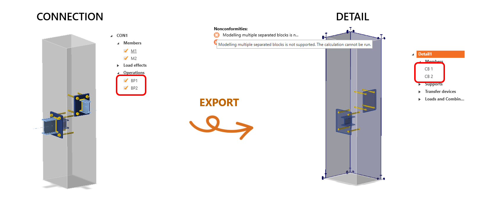 Yes, it is. And what happens after exporting the multiple anchoring from Connection to Detail? Two or more concrete blocks are imported to Detail depending on the number of base plates in the Connection, where every base plate has its own concrete blocks. The known limitation (see Known Limitation for Detail 3D) is that multiple solid blocks are not supported in Detail. So the user has to delete all blocks besides one, and relate all the other base plates to that block. Then,  the correct anchor and weld forces distribution is reached.