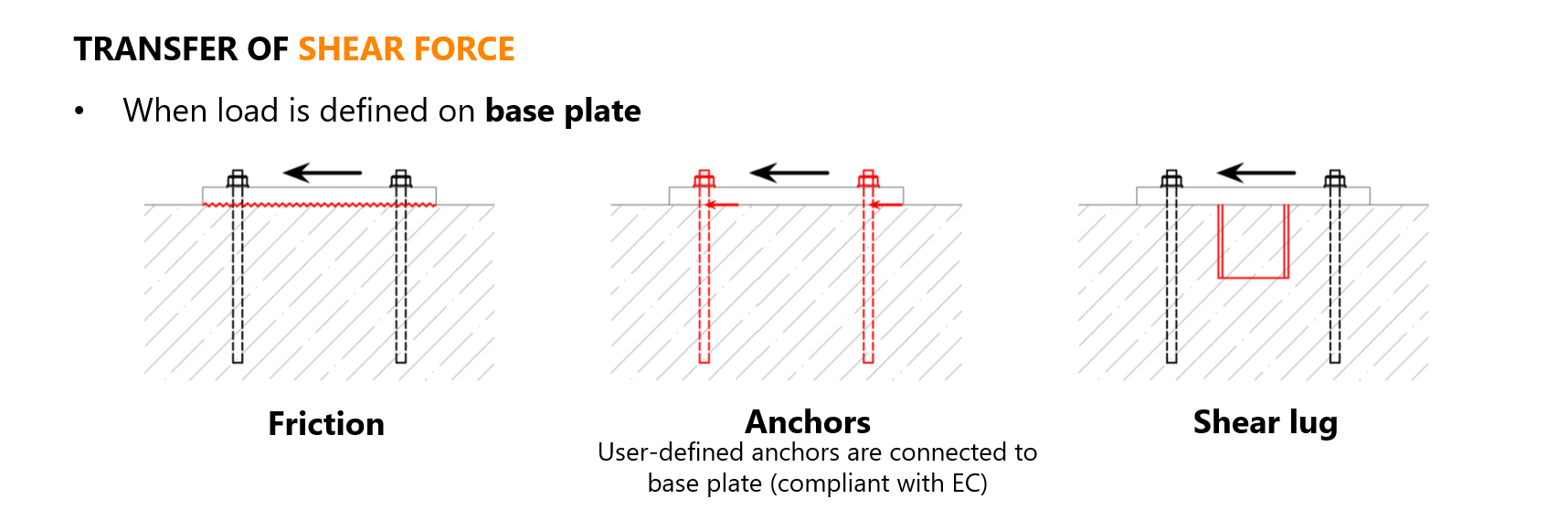 Shear force in base plates can be transferred via friction, anchors, or shear lugs, but only one method can be used at a time. For friction, ensure correct load case sequencing: apply compression (permanent) first, then shear (variable). If done incorrectly, the base plate may "fly away."