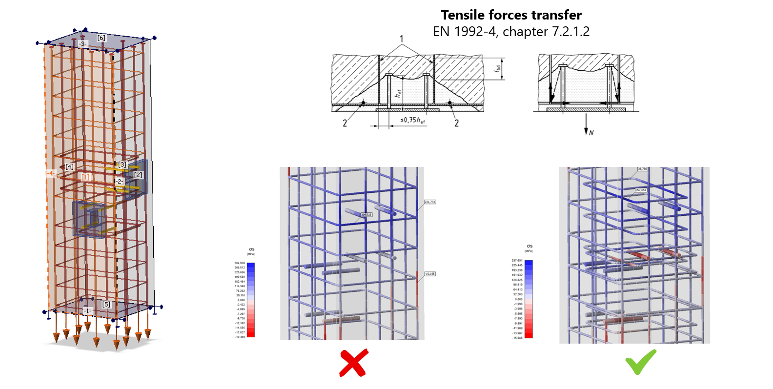 The designed reinforcement should follow code-based detailing rules (e.g., supplementary reinforcement for tensile and shear force transfer according to EN 1992-4). Detail 3D ensures proper force flow: compression zones in concrete and tension in rebars. Proper reinforcement is essential as concrete doesn’t transfer tension. Detailing rules are not automated—users must apply them manually, and it is the structural engineer's responsibility to reinforce the concrete block in the correct way.